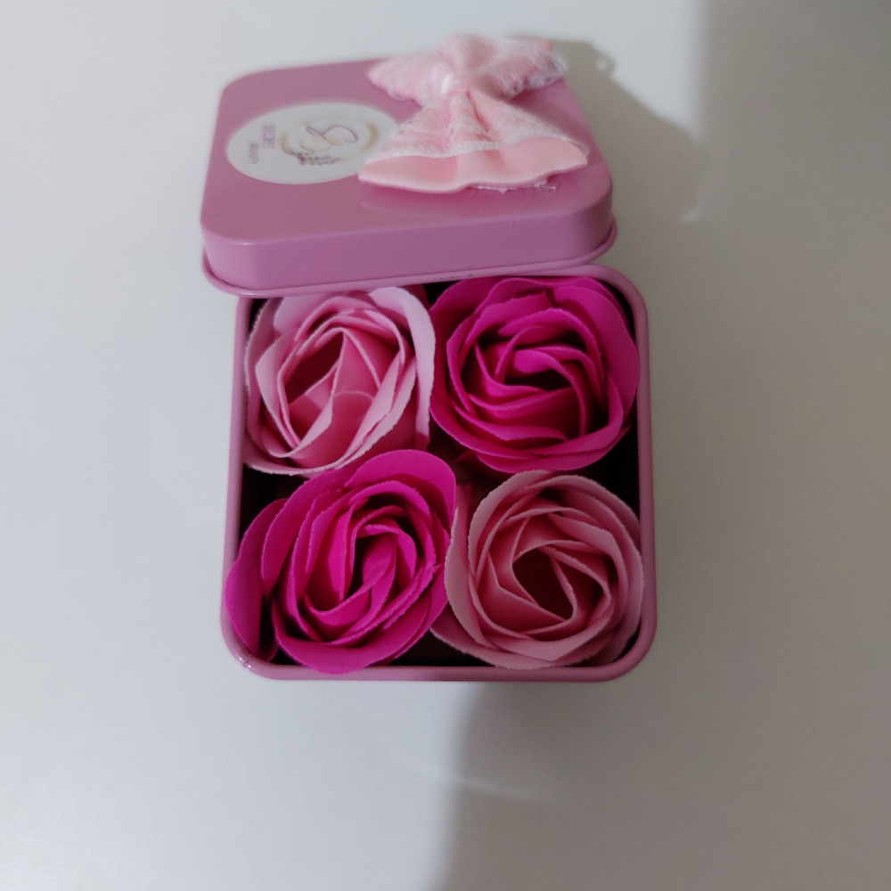Очень маленькие, но миленькие розочки. Размер коробочки 6см*6см*4см. Пахнут приятно. Для скромного подарка подойдут.