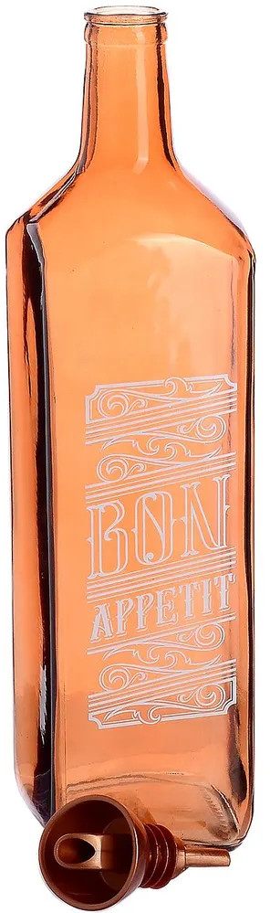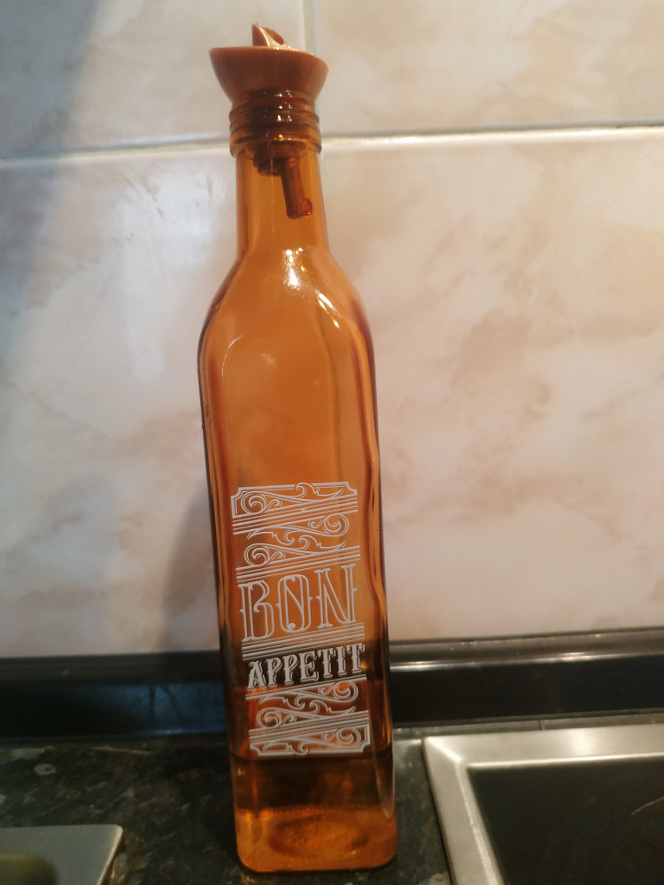 Основательная бутылка под масло. Удобно держать в руке. Масло выливается через горлышко, а остатки выливаются через маленькое отверстие обратно в бутылку.