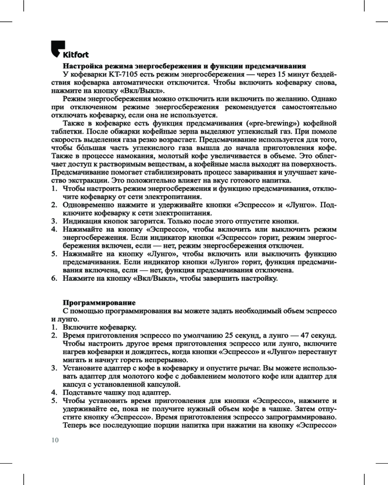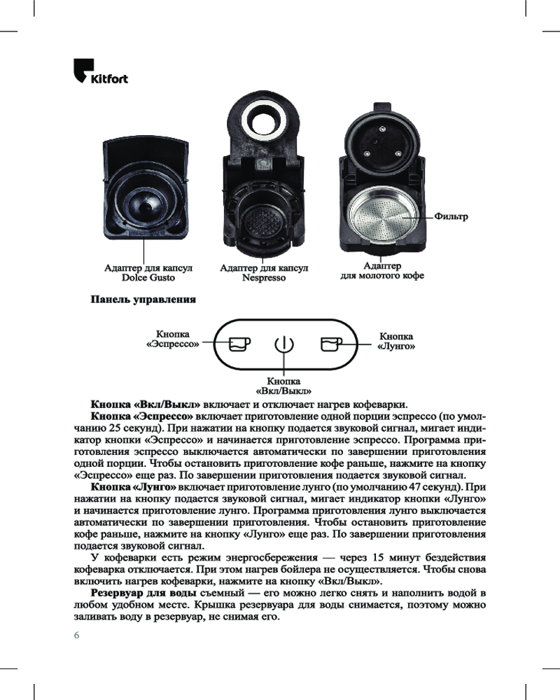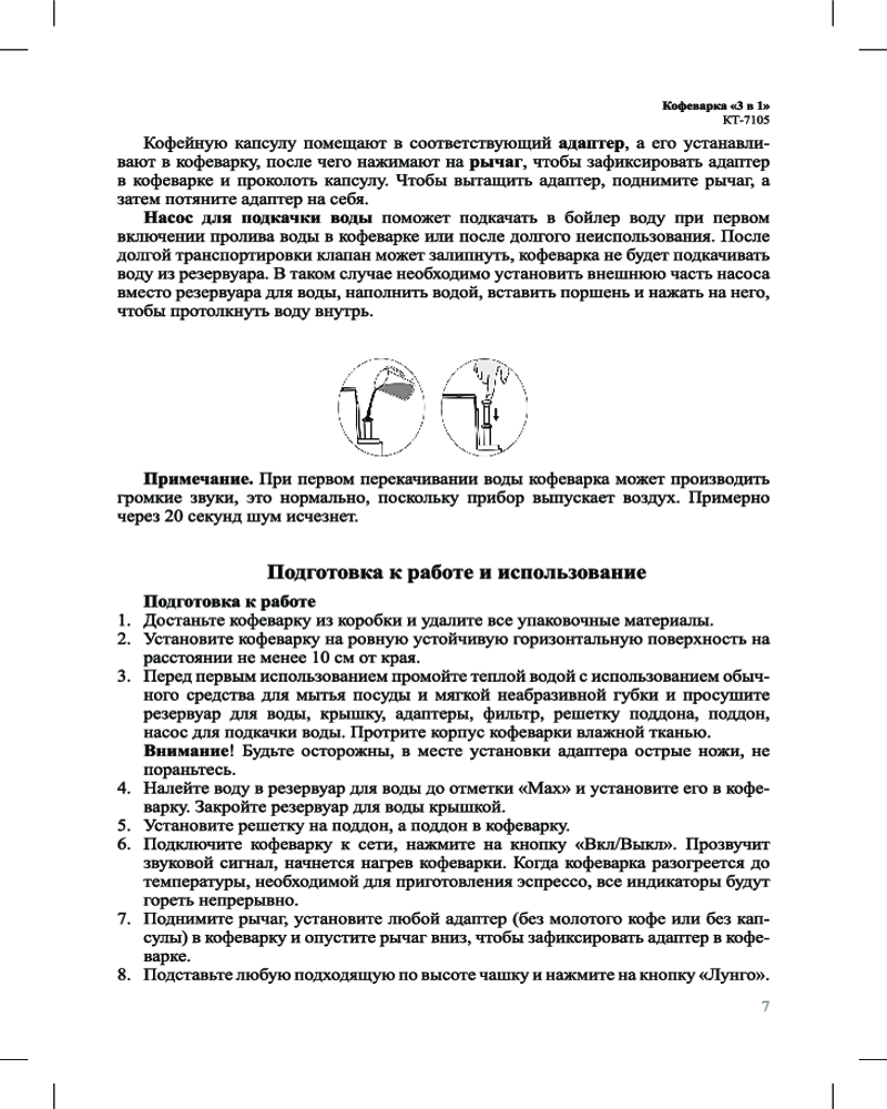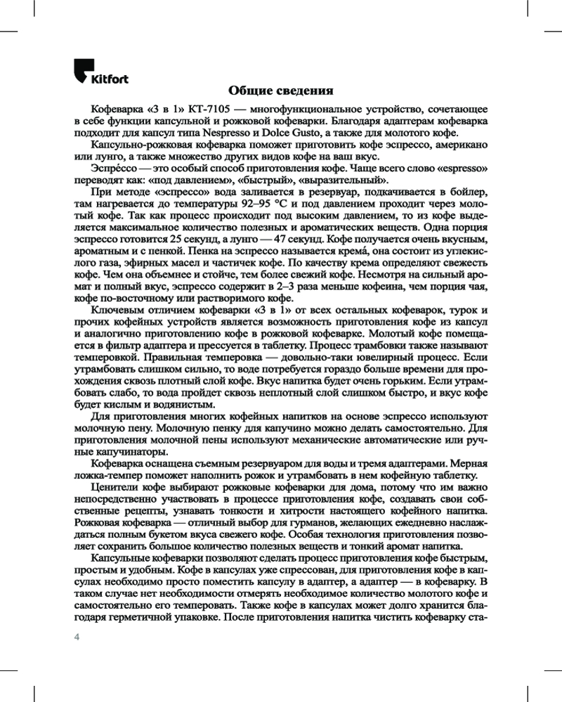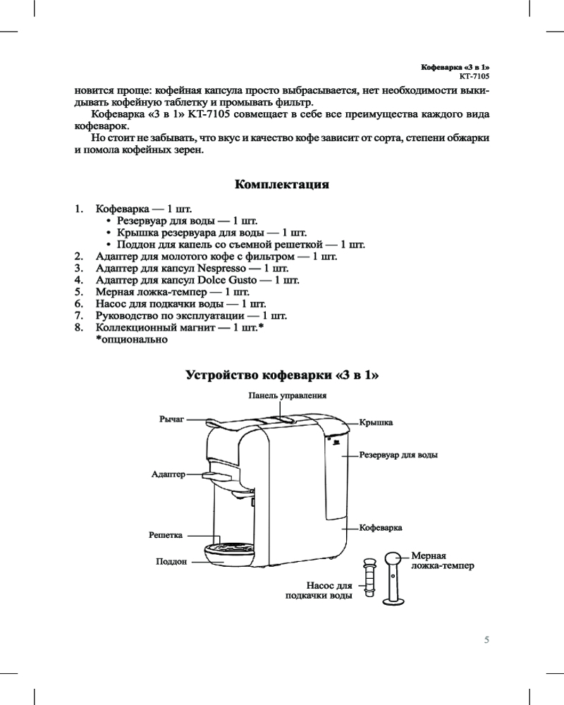 Кофеварка КТ-7105 — это многофункциональное устройство, сочетающее в себе функции капсульной и рожковой кофеварки. Она поможет приготовить кофе эспрессо, американо или лунго, а также множество других видов кофе на ваш вкус.