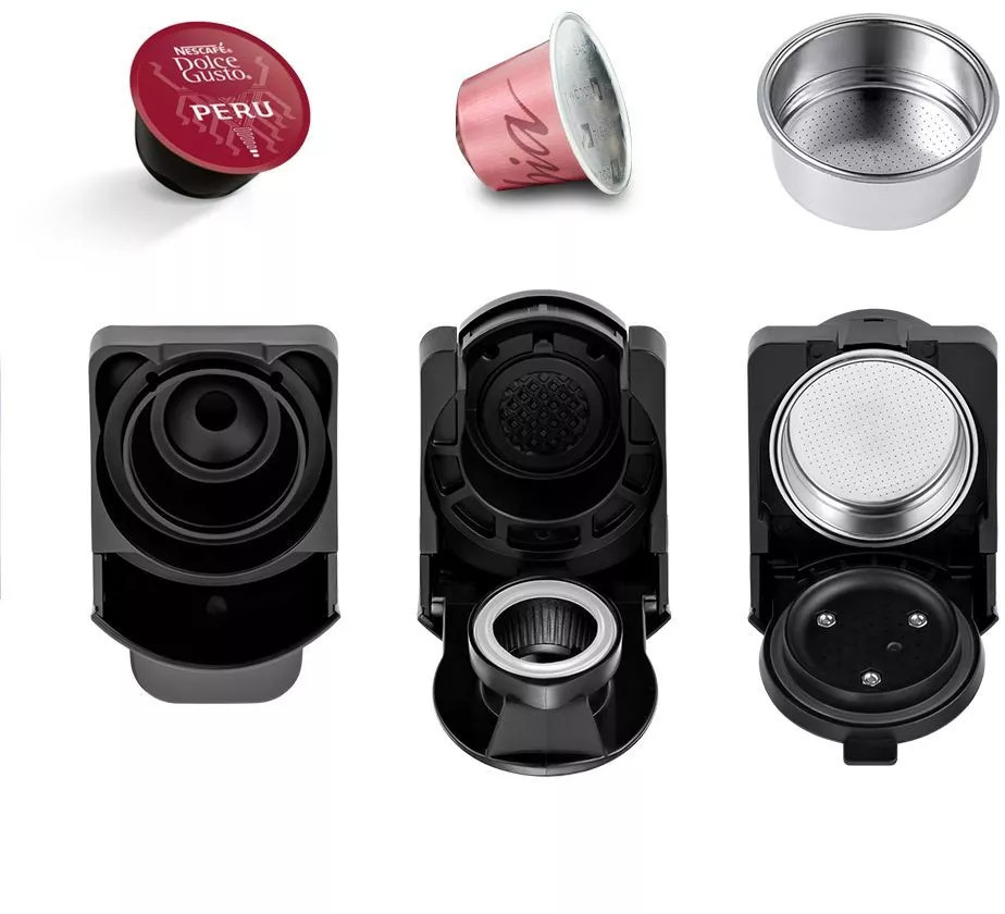 Благодаря 3 адаптерам, которые входят в комплект, кофеварка подходит для капсул типа Nespresso и Dolce Gusto, а также для молотого кофе. Она прекрасно совмещает в себе все преимущества каждого типа кофеварок и готовит под давлением 19 бар.