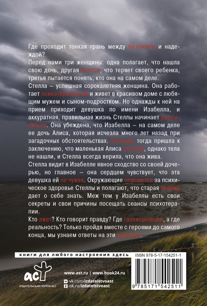 Стелла — успешная сорокалетняя женщина. Она работает психотерапевтом и живет в красивом доме с любящим мужем и сыном-подростком. Но однажды к ней на прием приходит девушка по имени Изабелла, и аккуратная, правильная жизнь Стеллы начинает рассыпаться. Она убеждена, что Изабелла — на самом деле ее дочь, Алиса, которая исчезла много лет назад при загадочных обстоятельствах. Полиция тогда пришла к заключению, что маленькая Алиса утонула, однако тела не нашли, и Стелла всегда верила, что она жива.
