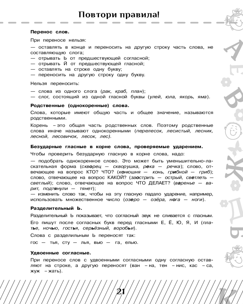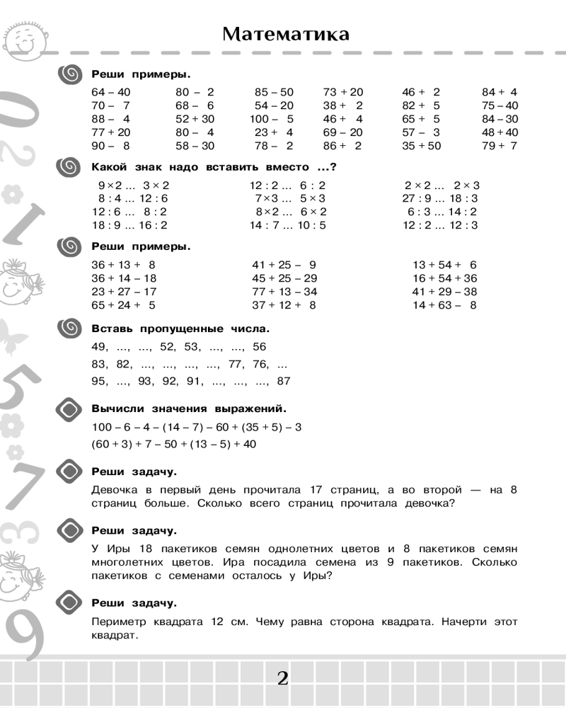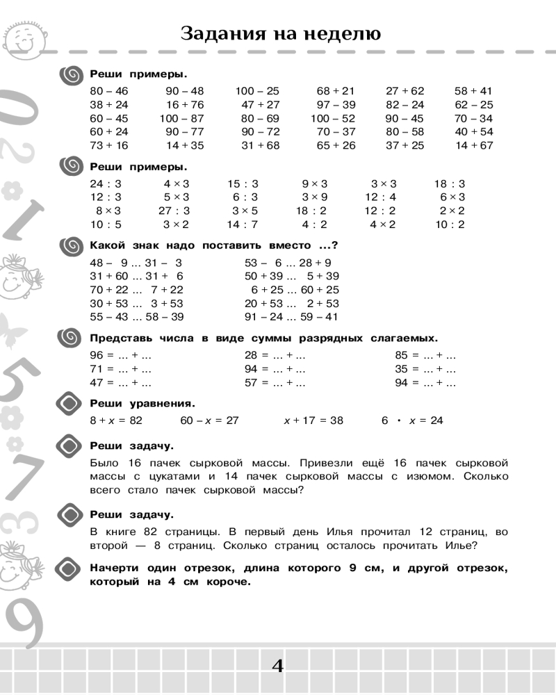 Регулярно обращаясь к материалу этих книг, ученик доведёт до автоматизма умение решать задачи, неравенства, навыки грамотного письма и твёрдо запомнит математические и орфографические правила, которые входят в программу начальной школы.