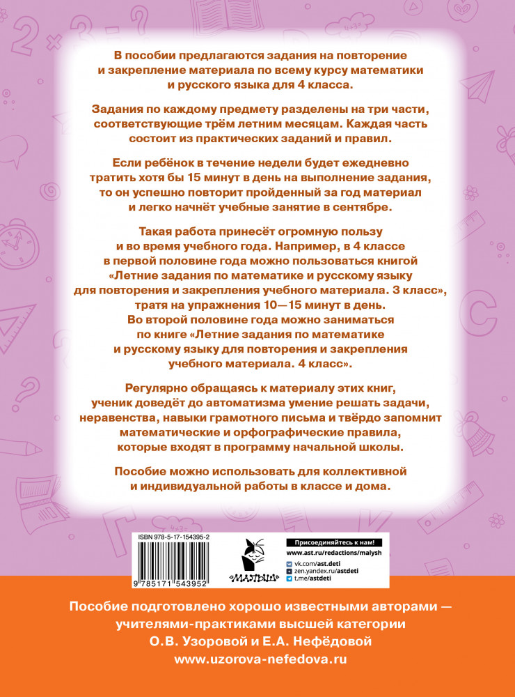 Летние задания по математике и русскому языку для повторения и закрепления учебного материала. 4 классОльга Васильевна Узорова, Елена Алексеевна Нефедова +31 легкие задания хорошие задания общее развитие