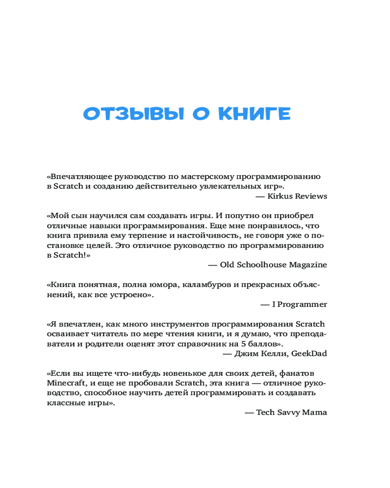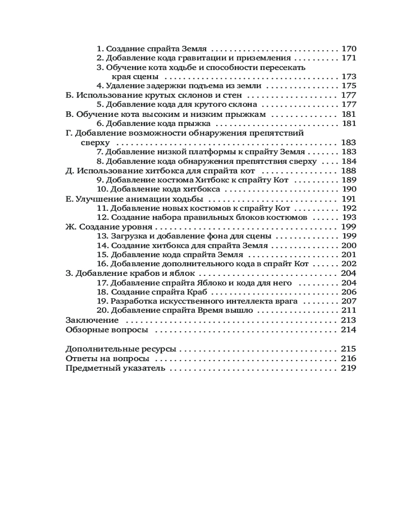 Каждой из этих игр посвящена отдельная глава, которая включает в себя пошаговые инструкции, наглядные иллюстрации, контрольные вопросы для самопроверки и творческие задачи. Программирование еще никогда не было таким захватывающим!