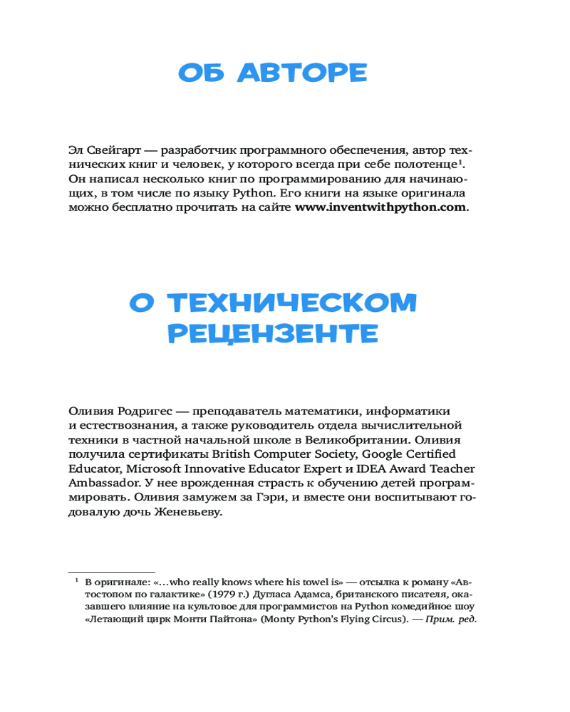 Эл Свейгарт — разработчик программного обеспечения и автор книг по программированию для детей. Написал более 15 обучающих книг про Scratch и Python. На языке оригинала их можно бесплатно прочитать на сайте www.inventwithpython.com |