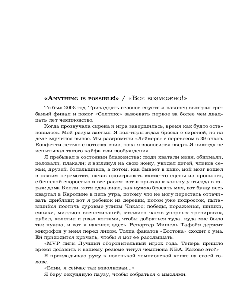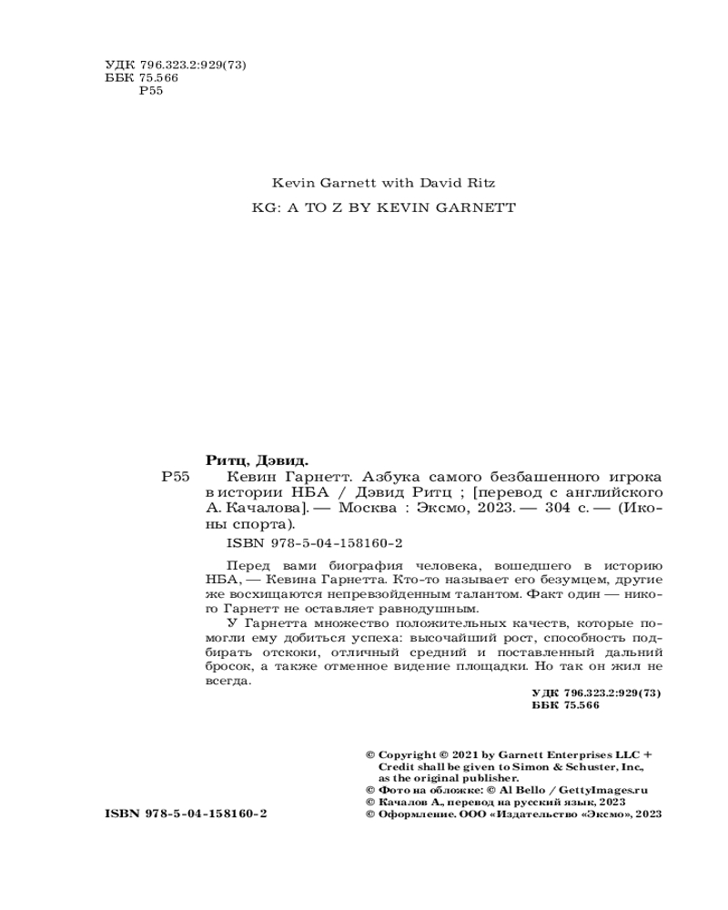 💳 Оплатить за товар можно при получении 🇰🇿 Есть бесплатная доставка по Казахстану 🎁 Копите бонусы с каждой покупки Серия: Иконы спорта Перед вами биография человека, вошедшего историю НБА — Кевина Гарнетта. Кто-то называет его безумцем, другие же восхищаются непревзойдённым талантом. Факт один — никого Гарнетт не оставляет равнодушным. У Гарнетта множество положительных качеств, которые помогли ему добиться успеха: высочайший рост, способность подбирать отскоки, отличный средний и поставленный дальний бросок, а также отменное видение площадки. Но так он жил не всегда. В этой книге рассказывается весь его тернистый путь к славе. Жизнь и взросление в Южной Каролине, потом переезд в Чикаго, где он и стал одним из самых перспективных спортсменов в стране. Судьбоносное решение бросить колледж и стать первым игроком за два десятилетия, который поступил на драфт прямо из старшей школы в составе «Миннесота Тимбервулвз». Он положил начало тенденции, которой последуют будущие суперзвезды, такие как Коби Брайант и Леброн Джеймс. В своей книге автор делится историями игр Гарнетта вместе с Брайантом, Джеймсом, Майклом Джорданом и другими великими игроками НБА, а также ведет хронику его профессиональных взлетов и падений, включая победу в чемпионате с «Бостон Селтикс». |