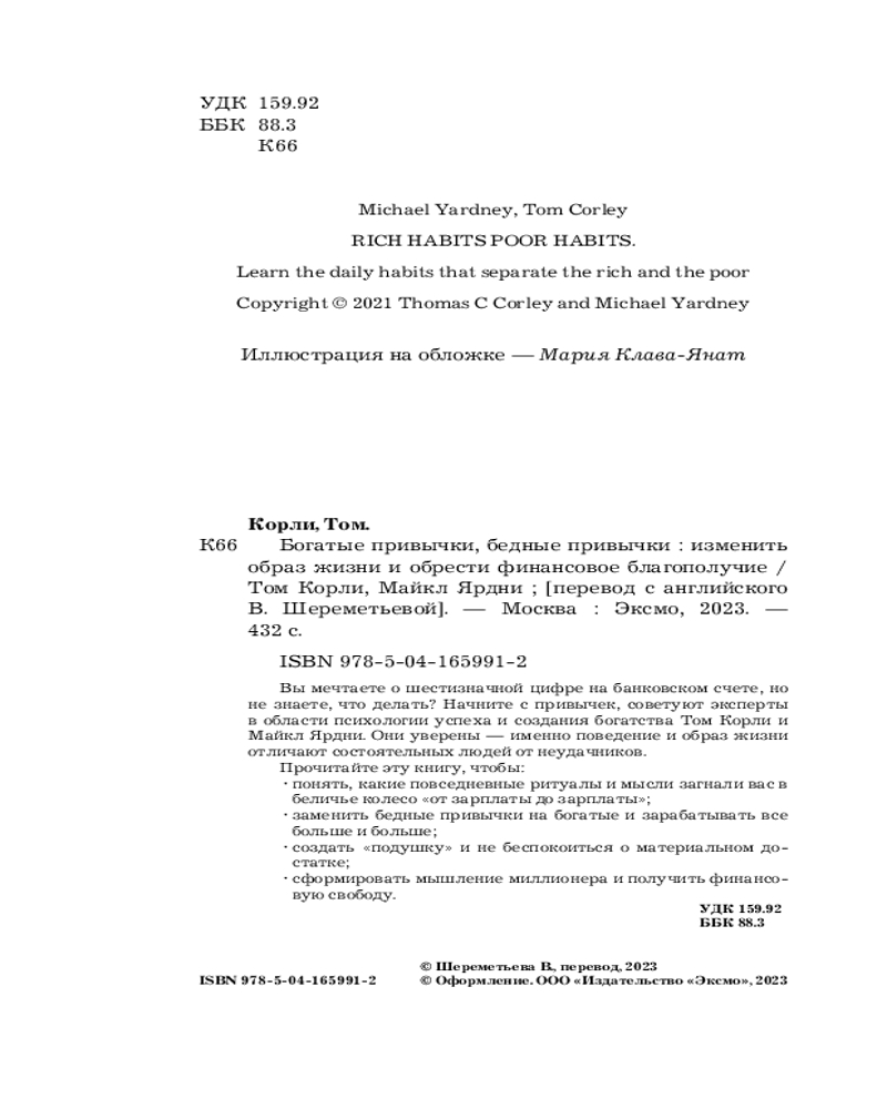 💳 Оплатить за товар можно при получении 🇰🇿 Есть бесплатная доставка по Казахстану от 1 дня 🎁 Копите бонусы с каждой покупки Серия: Мышление миллионера Вы мечтаете о шестизначной цифре на банковском счете, но не знаете, что делать? Начните с привычек, советуют эксперты в области психологии успеха и создания богатства Том Корли и Майкл Ярдни. Они уверены — именно поведение и образ жизни отличают состоятельных людей от неудачников. |