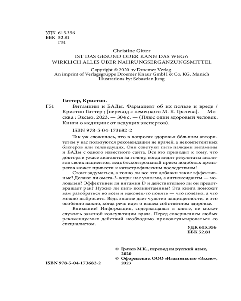 Серия: Плюс один здоровый человек. Книги о медицине от ведущих экспертов Ориентироваться в рынке витаминов и БАДов обычному покупателю очень сложно, а когда вокруг еще столько рекомендаций, задача быть здоровым становится практически невыполнимой. Человек может пропить курс совершенно ненужного ему витамина и заработать гипервитаминоз, а может не понять признаки недостатка витаминов и тем самым не предпринять своевременные действия. Именно поэтому Кристин Гиттер, опытный фармацевт из Германии, написала данную книгу, она даст ответы на ваши вопросы и развеет сомнения.