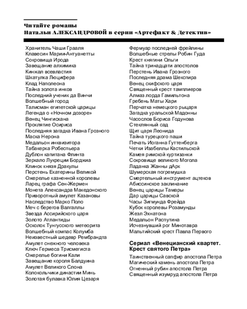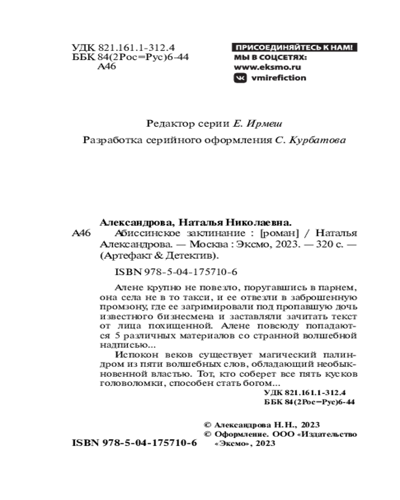 Детектив «Абиссинское заклинание» — захватывающая новинка автора серии «Артефакт&Детектив» Натальи Александровой. Таинственные магические слова — древнейший палиндром — обладает необыкновенной властью... |