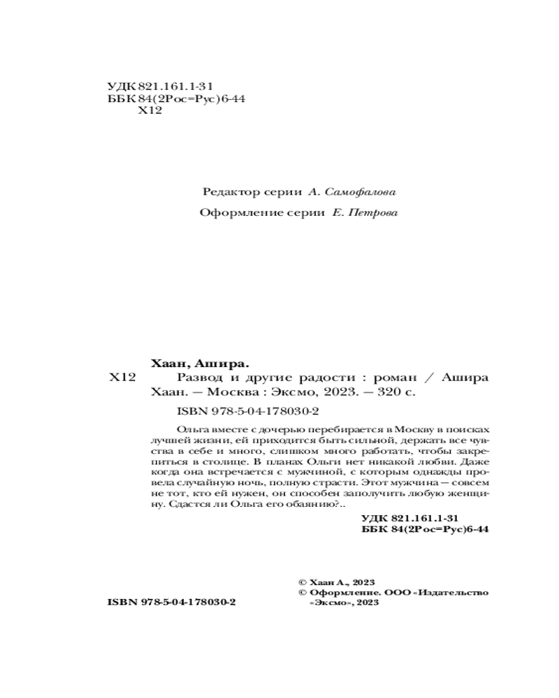 💳 Оплатить за товар можно при получении 🇰🇿 Есть бесплатная доставка по Казахстану от 1 дня 🎁 Копите бонусы с каждой покупки Серия: С чистого листа. Романы Аширы Хаан «Разведенка с прицепом» — это психологический роман Ашири Хаан о том, что в жизни нет ничего невозможного, можно подняться даже с самого глубокого дна и добиться успеха, особенно если у тебя появляется человек, который всегда тебя поддержит. «Разведенка с прицепом» — это книга о сильной женщине и о сильном мужчине, у которых, казалось бы, нет ничего общего, только невероятная тяга к жизни. |