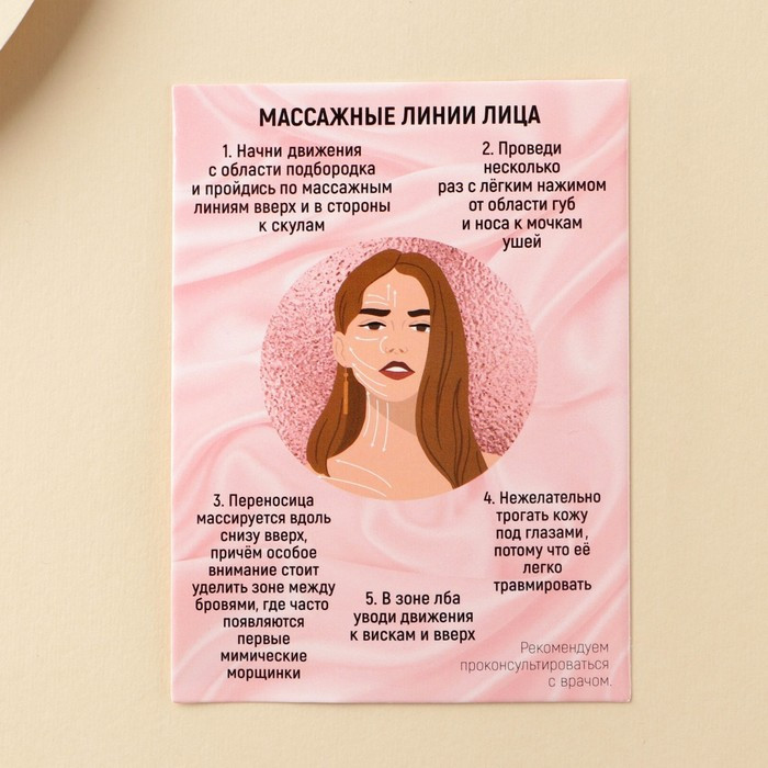 Способ применения: очистите лицо, нанесите увлажняющую сыворотку или масло. Возьмите массажёр и начните мягко нажимать на него. Двигайтесь по массажным линиям по 3 раза.
