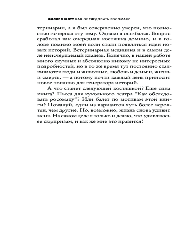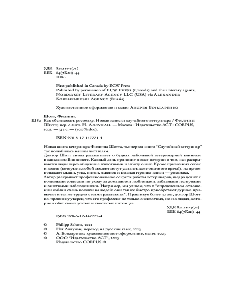 💳 Оплатить за товар можно при получении 🇰🇿 Есть бесплатная доставка по Казахстану от 1 дня 🎁 Копите бонусы с каждой покупки Серия: 100%.doc Новая книга ветеринара Филиппа Шотта, чья первая книга «Случайный ветеринар» так полюбилась нашим читателям. Доктор Шотт снова рассказывает о буднях небольшой ветеринарной клиники в канадском Виннипеге. Каждый день приносит новые истории о том, как раскрываются люди через общение с животными и заботу о них. Кроме привычных собак и кошек (которые в любой момент могут удивить даже опытного врача!), на прием попадают мыши, утка, питон, львенок и главная героиня книги — росомаха. |