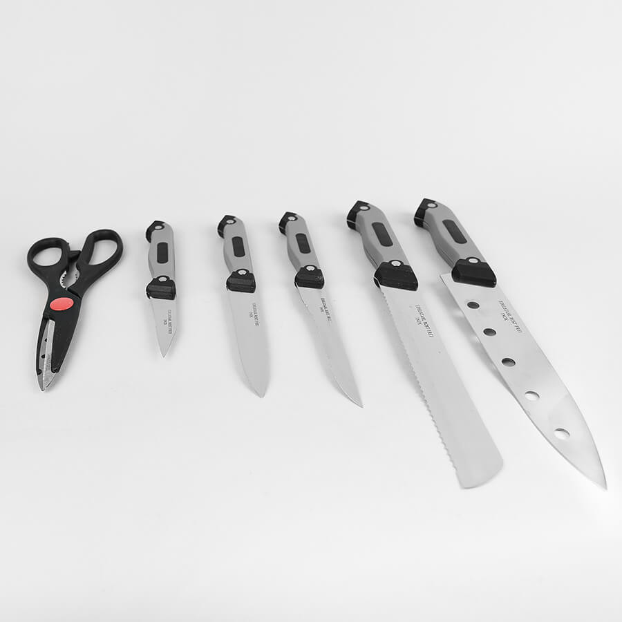 В данный момент этот товар отсутствует в продаже. Возможно, у нас найдется аналогичный или похожий товар здесь. Серия: Basic Набор состоит из пяти ножей, кухонных ножниц и деревянной подставки. Сделаны инструменты из высококачественной нержавеющей стали. Удобные пластиковые ручки, профессиональная заточка, эргономичный дизайн.
