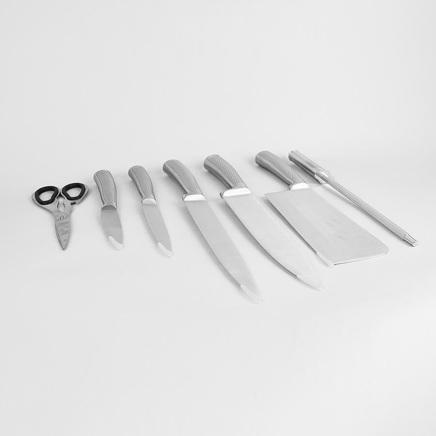 В данный момент этот товар отсутствует в продаже. Возможно, у нас найдется аналогичный или похожий товар здесь. Серия: Classic Набор состоит из 8 предметов: 5 ножей, муссат, кухонные ножницы, акриловая подставка. Отличительной особенностью данного набора является металлическая ребристая рукоятка ножа, удобно ложащаяся в руку. Ножи изготовлены из высококачественной нержавеющей стали, прекрасно отбалансированы, имеют острую профессиональную заточку лезвия.