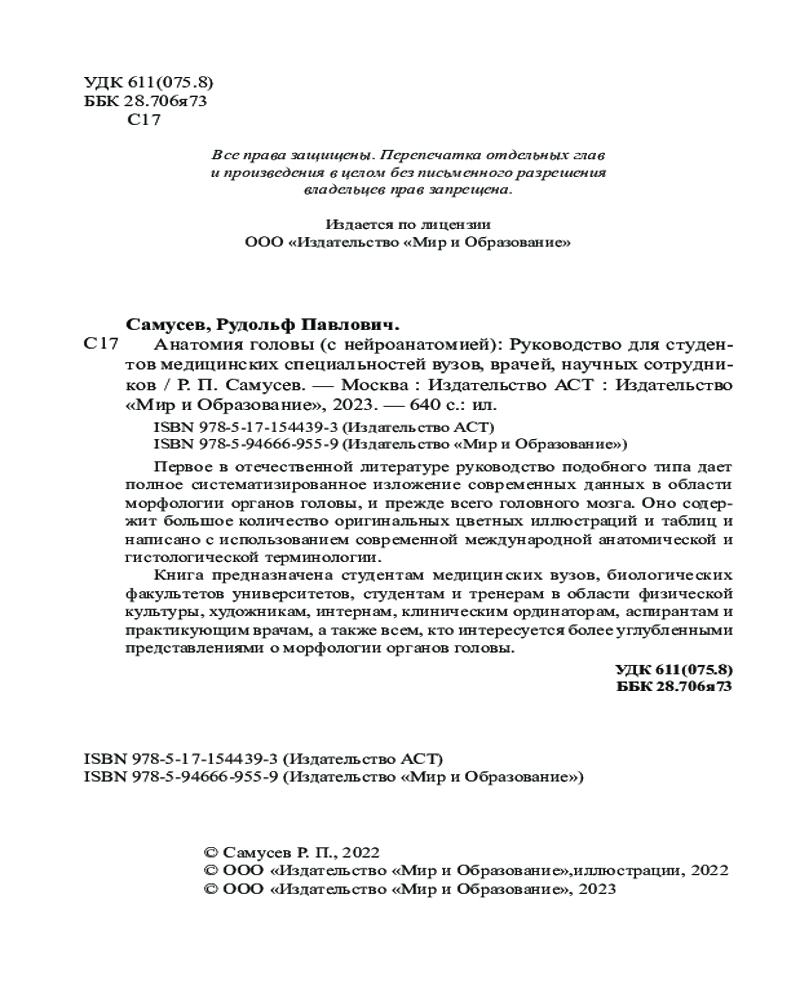 💳 Оплатить за товар можно при получении 🇰🇿 Есть бесплатная доставка по Казахстану от 1 дня 🎁 Копите бонусы с каждой покупки Серия: Самусев. Анатомия Первое в отечественной литературе руководство подобного типа дает полное систематизированное изложение современных данных в области морфологии органов головы, и прежде всего головного мозга. Оно содержит большое количество оригинальных цветных иллюстраций и таблиц и написано с использованием современной международной анатомической и гистологической терминологии. |