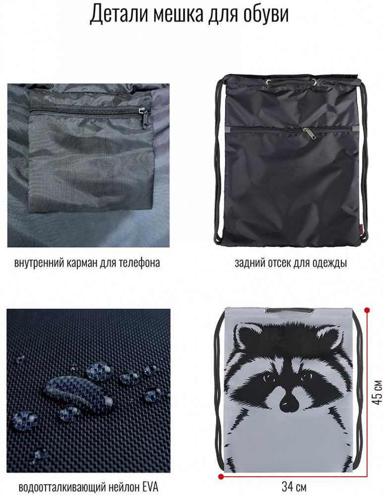 • мешок имеет внутренний карман на молнии для мелочей и телефона;