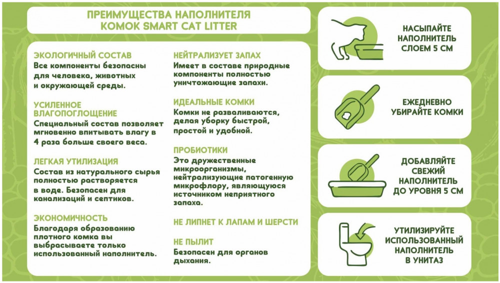 Наполнитель хороший, имеет приятный запах, который не отталкивает моего кота. Хорошо маскирует запах экскрементов. Очень удобно, что комкуется, удалил комочек и деток снова чистый. К покупке рекомендую.