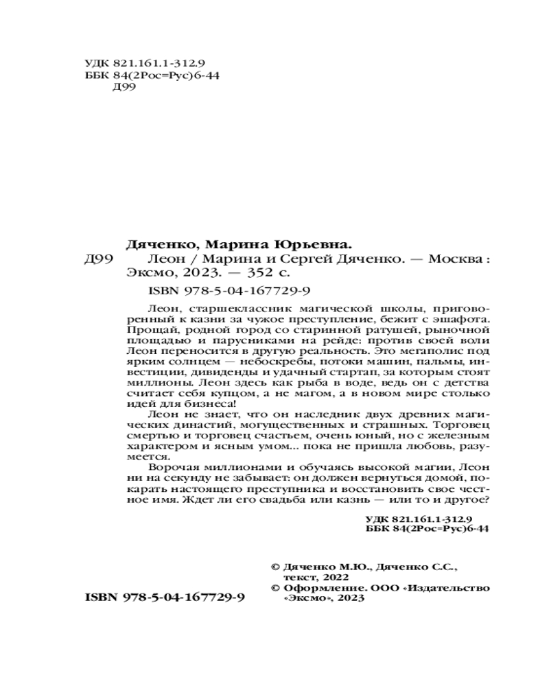💳 Оплатить за товар можно при получении 🇰🇿 Есть бесплатная доставка по Казахстану от 1 дня 🎁 Копите бонусы с каждой покупки Серия: Метафантастика Марины и Сергея Дяченко Супруги Дяченко — родились в Киеве, писатели-соавторы, сценаристы, лауреаты более ста литературных премий. Последние десять лет жили в США, писали на русском языке в жанрах современной научной фантастики, фэнтези и сказки. Их книги переведены и издаются в Америке, Великобритании, Германии, Франции, Италии, Испании, Бразилии, Китае и других странах. После смерти в 2022 году Сергея Дяченко, своего мужа, друга и соавтора, Марина продолжает их общее дело, как и обещала Сергею. |
