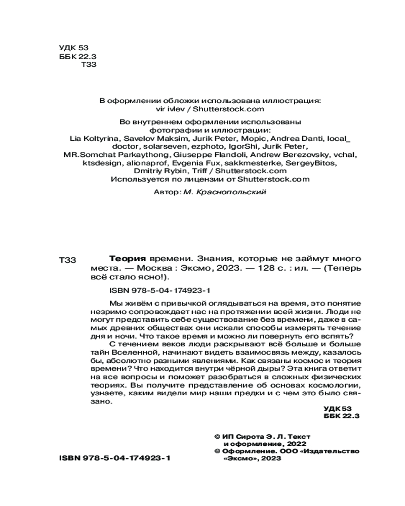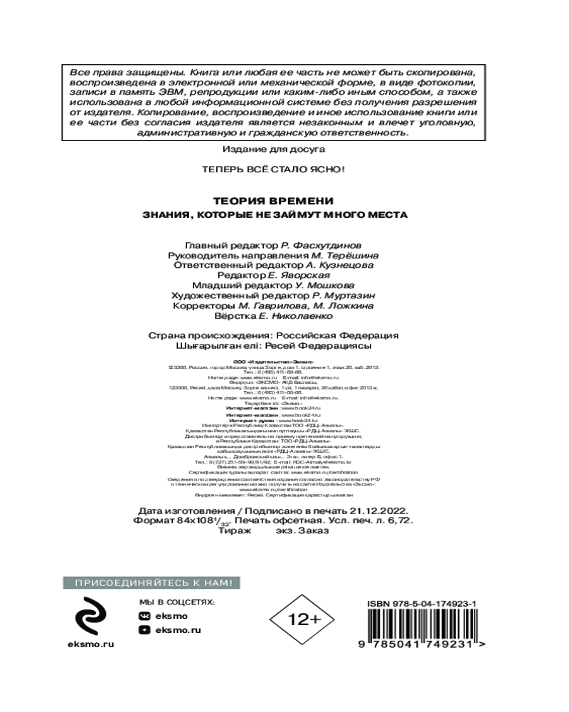 Теория времени. Знания, которые не займут много местаВ данный момент этот товар отсутствует в продаже. Возможно, у нас найдется аналогичный или похожий товар здесь. Серия: Теперь всё стало ясно! С чего началась наша Вселенная? Есть ли у нее конец, а если да, то какой? Что такое время и можно ли его повернуть вспять? Множество ученых и философов издавна задавались этими вопросами. В XX веке был совершен настоящий прорыв в научном знании, и на многие вопросы у нас есть если не ответы, то хотя бы предположения. Эта книга поможет вам составить свое собственное мнение о предмете, простым и доступным языком объясняя сложные физические термины, законы и научные теории, связанные с понятием времени. Вы узнаете, возможно ли путешествовать во времени и как такие путешествия могут быть устроены. А мягкая обложка и удобный карманный формат позволят читать книгу где угодно — в метро, дома, в дороге, на отдыхе и т.д. |