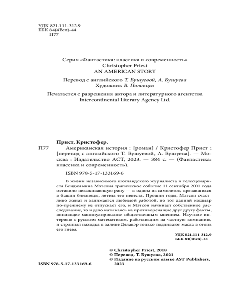 💳 Оплатить за товар можно при получении 🇰🇿 Есть бесплатная доставка по Казахстану от 1 дня 🎁 Копите бонусы с каждой покупки Серия: Фантастика: классика и современность В жизни независимого шотландского журналиста и телесценариста Бенджамина Мэтсона трагическое событие 11 сентября 2001 года оставило незаживающую рану — в одном из самолетов, врезавшихся в башни-близнецы, летела его невеста. Прошли годы, Мэтсон счастливо женат и занимается любимой работой, но тот давний кошмар по-прежнему не отпускает его, и Мэтсон начинает собственное расследование, то и дело натыкаясь на противоречащие друг другу факты, вопиющее манипулирование общественным мнением. Научное интервью с русским математиком, работающим на частную компанию, и странная находка в заливе Делавэр только подливают масла в огонь его гнева. |