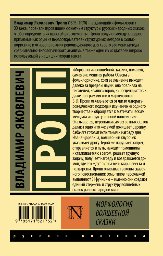💳 Оплатить за товар можно при получении 🇰🇿 Есть бесплатная доставка по Казахстану от 1 дня 🎁 Копите бонусы с каждой покупки Серия: Эксклюзив: Русская классика «Морфология волшебной сказки», пожалуй, самая знаменитая работа XX века в фольклористике, хотя ее значение выходит далеко за пределы науки: она повлияла на писателей, композиторов, киносценаристов и даже программистов и маркетологов. В. Я. Пропп отказывается от чисто литературоведческого подхода к изучению народного творчества и обращается к математическим методам и структуральной лингвистике. |