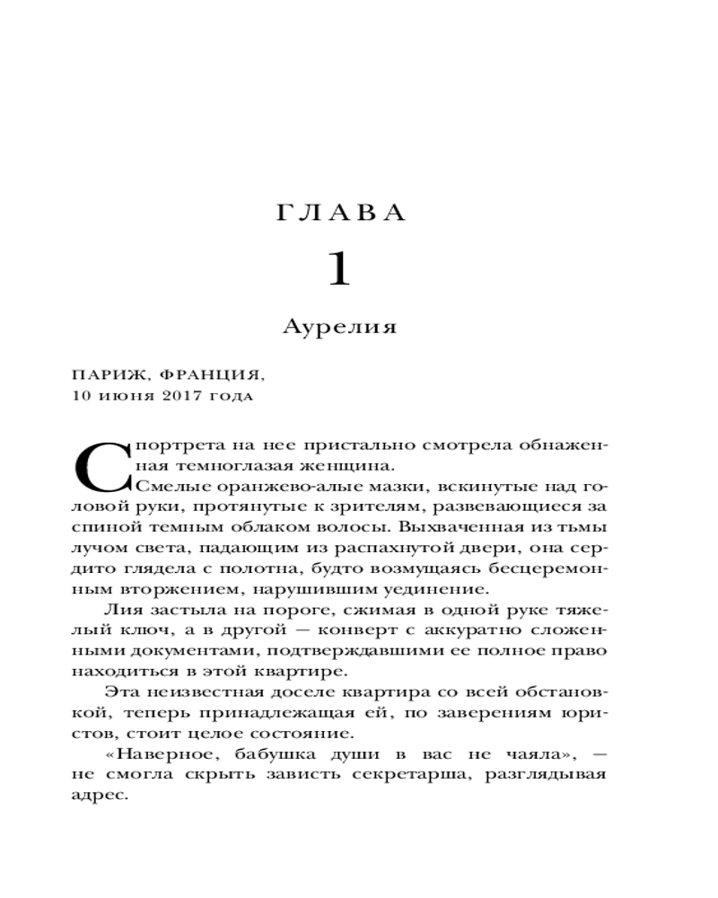 2017 год, Лондон. Когда бабушка Аурелии умирает, она оставляет внучке маленькую парижскую квартиру. Аурелия еще не знает, что найдет в квартире коллекцию украшений и платьев, а одна из картин окажется ключом к разгадке главной тайны ее бабушки. Вместе с Габриэлем Сеймуром, реставратором с загадочным прошлым, героине предстоит раскрыть правду, скрытую в стенах парижской квартиры.