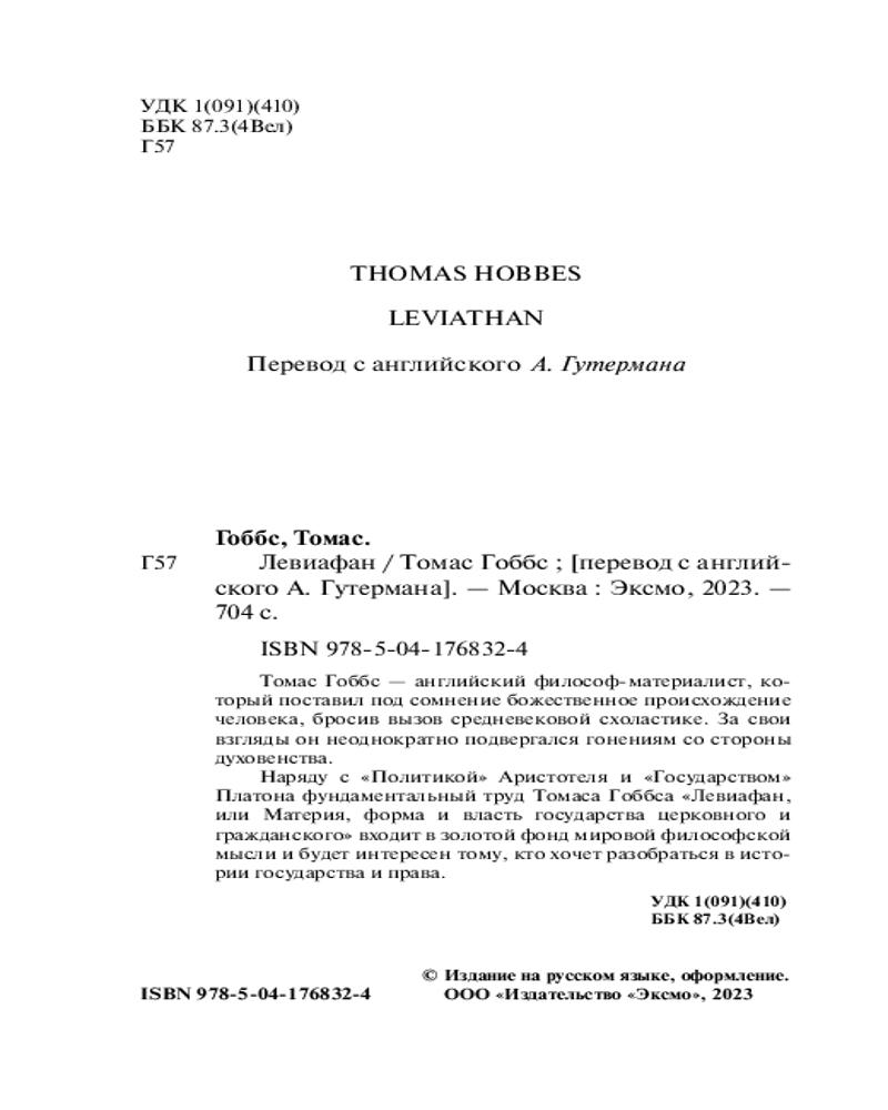 ЛевиафанВ данный момент этот товар отсутствует в продаже. Возможно, у нас найдется аналогичный или похожий товар здесь. Серия: Pocket book (обложка). Non-fiction Томас Гоббс — английский философ-материалист, который поставил под сомнение божественное происхождение человека, бросив вызов средневековой схоластике. За свои взгляды он неоднократно подвергался гонениям со стороны духовенства. Наряду с «Политикой» Аристотеля и «Государством» Платона фундаментальный труд Томаса Гоббса «Левиафан, или Материя, форма и власть государства церковного и гражданского» входит в «золотой фонд» мировой философской мысли и будет интересен тому, кто хочет самостоятельно разбираться в истории государства и права. |