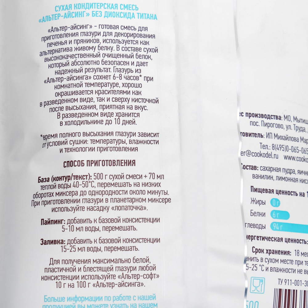 💳 Оплатить за товар можно при получении 🇰🇿 Есть бесплатная доставка по Казахстану от 1 дня 🎁 Копите бонусы с каждой покупки «Альтер-айсинг» — готовая водорастворимая смесь приготовления глазури для декорирования печенья и пряников, используется как альтернатива живому белку. В составе сухой высококачественный очищенный белок, который абсолютно безопасен и дает надежный результат. Глазурь из «Альтер-айсинга» сохнет 6-8 часов при комнатной температуре, хорошо окрашивается красителями как в разведенном виде, так и сверху кисточкой после высыхания, приятная на вкус. В разведенном виде хранится в холодильнике до 10 дней. Время полного высыхания глазури зависит от условий сушки: температуры, влажности и технологии приготовления. |
