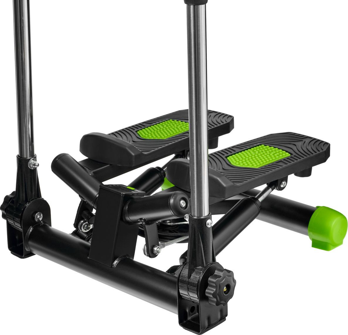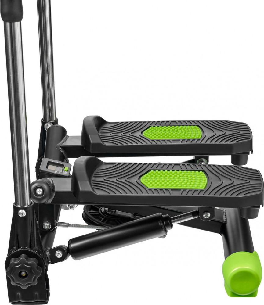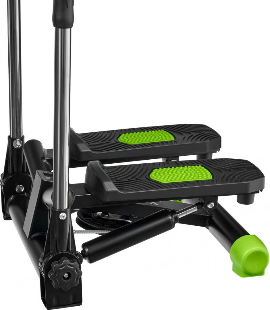 Мини-степпер имитирует подъем по лестнице со ступени на ступень. Тренажер отличается оптимальным уровнем нагрузки до 15 кг, которую обеспечивают прочные гидравлические цилиндры. Предусмотрена возможность регулировки высоты педалей. Для дополнительной устойчивости и комфортной тренировки в комплекте есть складные поручни, которые можно отрегулировать по высоте. Педали министеппера имеют нескользящую поверхность. Стальная конструкция обладает высокой устойчивостью и выдерживает вес до 100 кг. Кардиотренажер оснащен электронным дисплеем. На дисплее отражается вся необходимая информация: расход калорий, время тренировки, общее количество шагов, количество шагов в минуту.