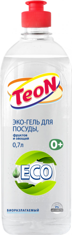 Эко-гель для посуды Teon — прозрачный гель для мытья посуды без агрессивных компонентов в составе — для ежедневного использования. Эко-гель предназначен для мытья посуды, для овощей и фруктов, детских игрушек. Гель легко споласкивается водой, не оставляет разводов на поверхности. Имеет нейтральный pH. Не сушит кожу рук. Гель биоразлагается.