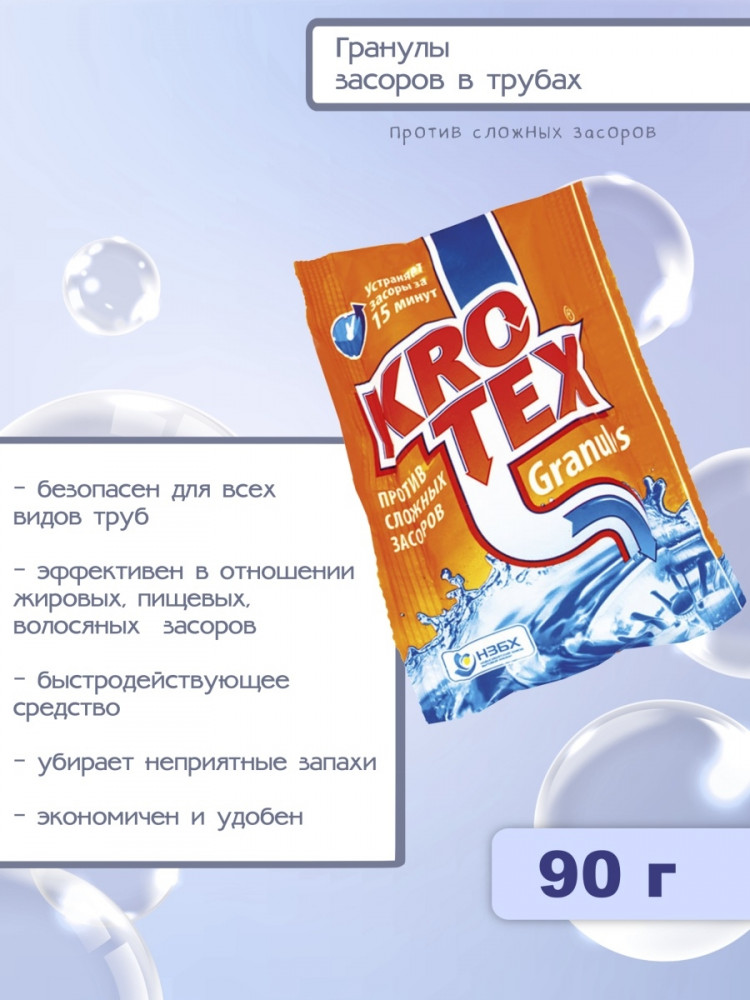 НЗБХ Средство для чистки труб гранулированноеВ данный момент этот товар отсутствует в продаже. Возможно, у нас найдется аналогичный или похожий товар здесь. Серия: Granules Krotex Granules — гранулированное средство для очистки труб в сашетах. Безупречная скорость чистоты. Быстрое и безопасное устранение засоров в любых видах труб. Время ожидания результата при устранении засоров — минимальное. В среднем, справляется с засором за 15 минут. Эффективен при засорах из остатков пищи, жировых засорах, от засоров из шерсти домашних животных, при волосяных засорах. Средство не пылит, не имеет резких запахов. |