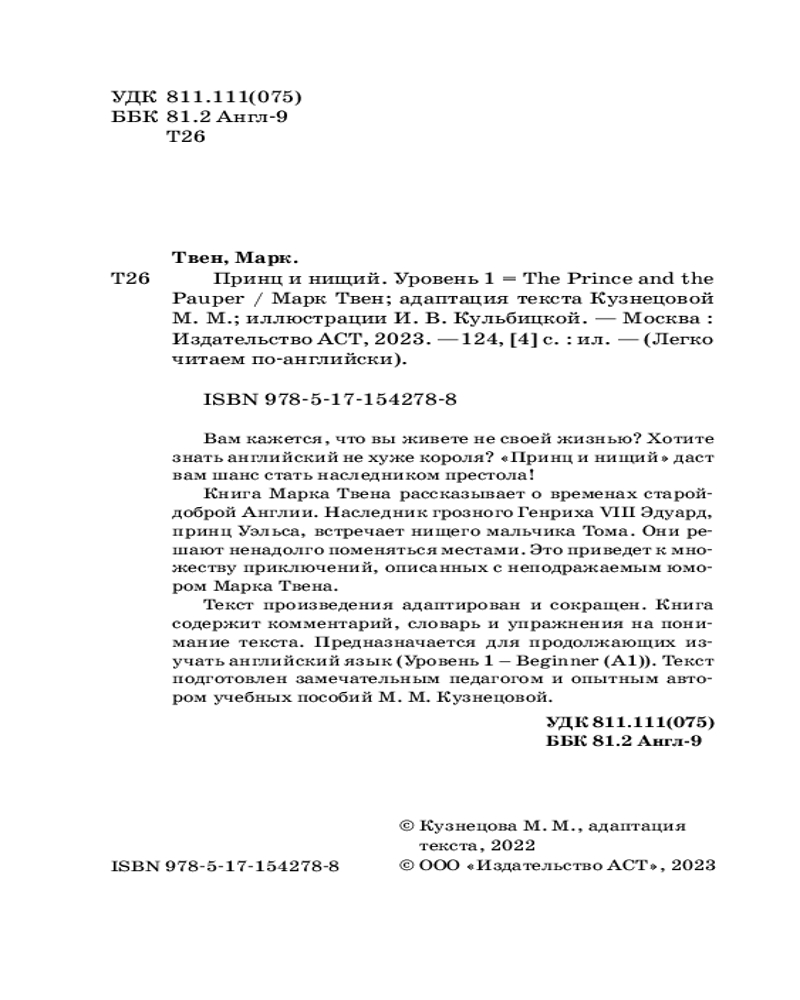 💳 Оплатить за товар можно при получении 🇰🇿 Есть бесплатная доставка по Казахстану от 1 дня 🎁 Копите бонусы с каждой покупки Серия: Легко читаем по-английски Вам кажется, что вы живете не своей жизнью? Хотите знать английский не хуже короля? «Принц и нищий» даст вам шанс попасть из грязи в князи! Книга Марка Твена рассказывает о временах старой доброй Англии. Наследник грозного Генриха VIII Эдуард, принц Уэльса, встречает нищего мальчика Тома. Они решают ненадолго поменяться местами. Это приведет к множеству приключений, описанных с неподражаемым юмором Марка Твена. |