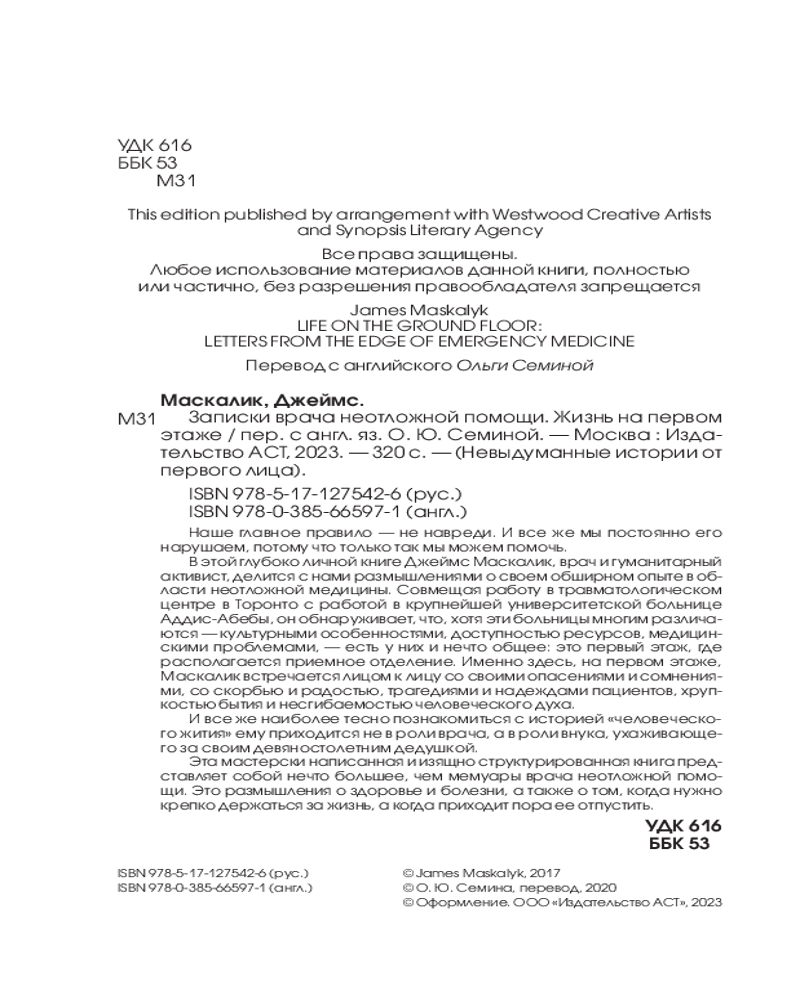 💳 Оплатить за товар можно при получении 🇰🇿 Есть бесплатная доставка по Казахстану от 1 дня 🎁 Копите бонусы с каждой покупки Серия: Невыдуманные истории от первого лица Совмещая работу в травматологическом центре в Торонто с работой в крупнейшей университетской больнице Аддис-Абебы, Джеймс Маскалик обнаруживает, что, хотя эти больницы многим различаются — культурными особенностями, доступностью ресурсов, медицинскими проблемами, — есть у них и нечто общее: это первый этаж, где располагается приемное отделение. Именно здесь, на первом этаже, Маскалик встречается лицом к лицу со своими опасениями и сомнениями, со скорбью и радостью, трагедиями и надеждами пациентов, хрупкостью бытия и несгибаемостью человеческого духа. |