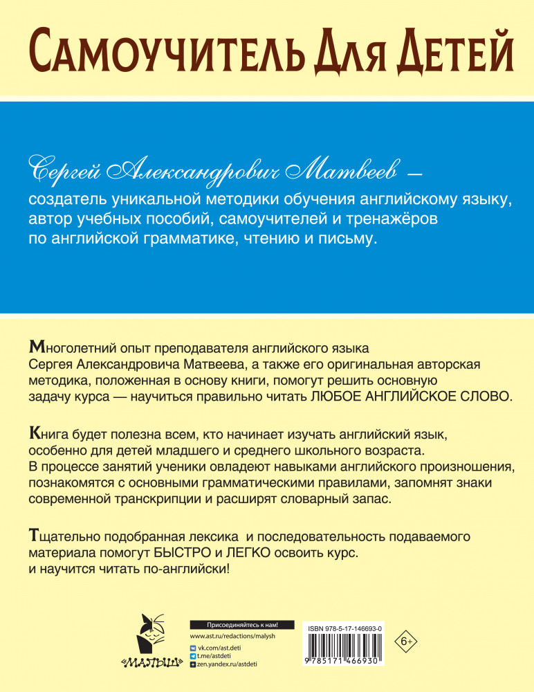 💳 Оплатить за товар можно при получении 🇰🇿 Есть бесплатная доставка по Казахстану от 1 дня 🎁 Копите бонусы с каждой покупки Серия: Самоучитель для детей «Научусь читать по-английски» — обучающее пособие, созданное по авторской методике А.С. Матвеева. В пособии в наглядной форме изложены основные правила чтения английских букв и буквосочетаний, а также даны задания для тренировки. В процессе обучения школьники научатся правильно читать английские слова, освоят знаки современной транскрипции и расширят словарный запас. |