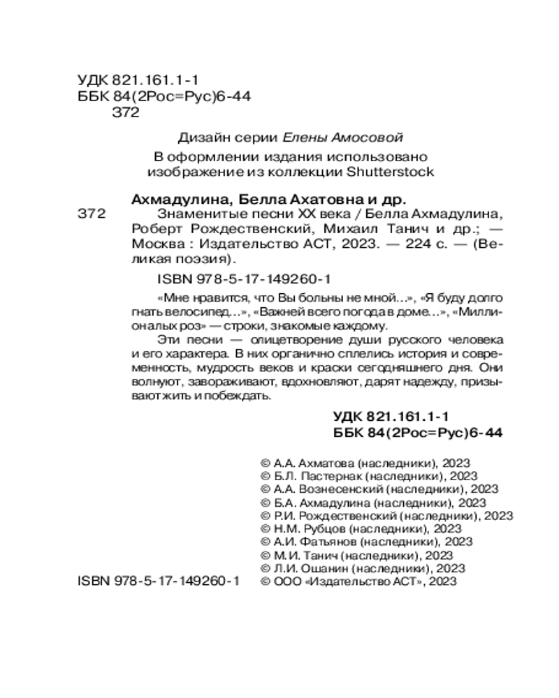Знаменитые песни XX векаМихаил Исаевич Танич, Сергей Александрович Есенин, Белла Ахатовна Ахмадулина В данный момент этот товар отсутствует в продаже. Возможно, у нас найдется аналогичный или похожий товар здесь. Серия: Великая поэзия «Отговорила роща золотая...», «Мне нравится, что Вы больны не мной...», «Я буду долго гнать велосипед...», «Важней всего погода в доме...», «Миллион алых роз» — строки, знакомые каждому. |
