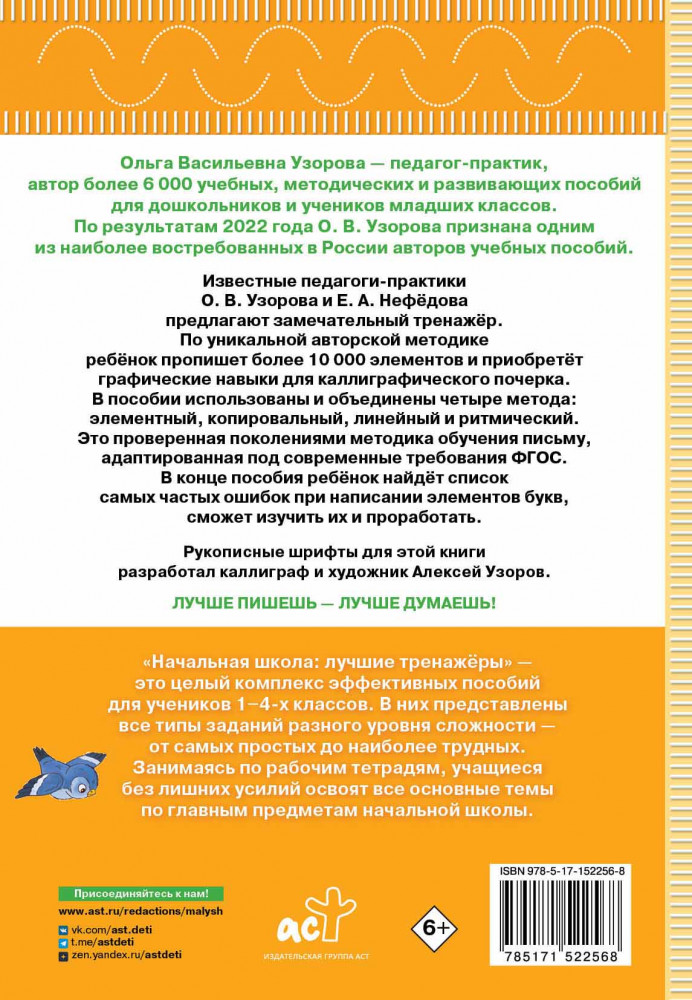 💳 Оплатить за товар можно при получении 🇰🇿 Есть бесплатная доставка по Казахстану от 1 дня 🎁 Копите бонусы с каждой покупки Серия: Начальная школа: лучшие тренажёры «Тренажёр по чистописанию. Послебукварный период. 1 класс» — это пособие, в котором собраны задания для выработки аккуратного и красивого почерка. По уникальной авторской методике ребёнок напишет более 10000 элементов, приобретёт графические навыки для каллиграфического почерка и разберёт основные ошибки, которые можно допустить при написании элементов. |