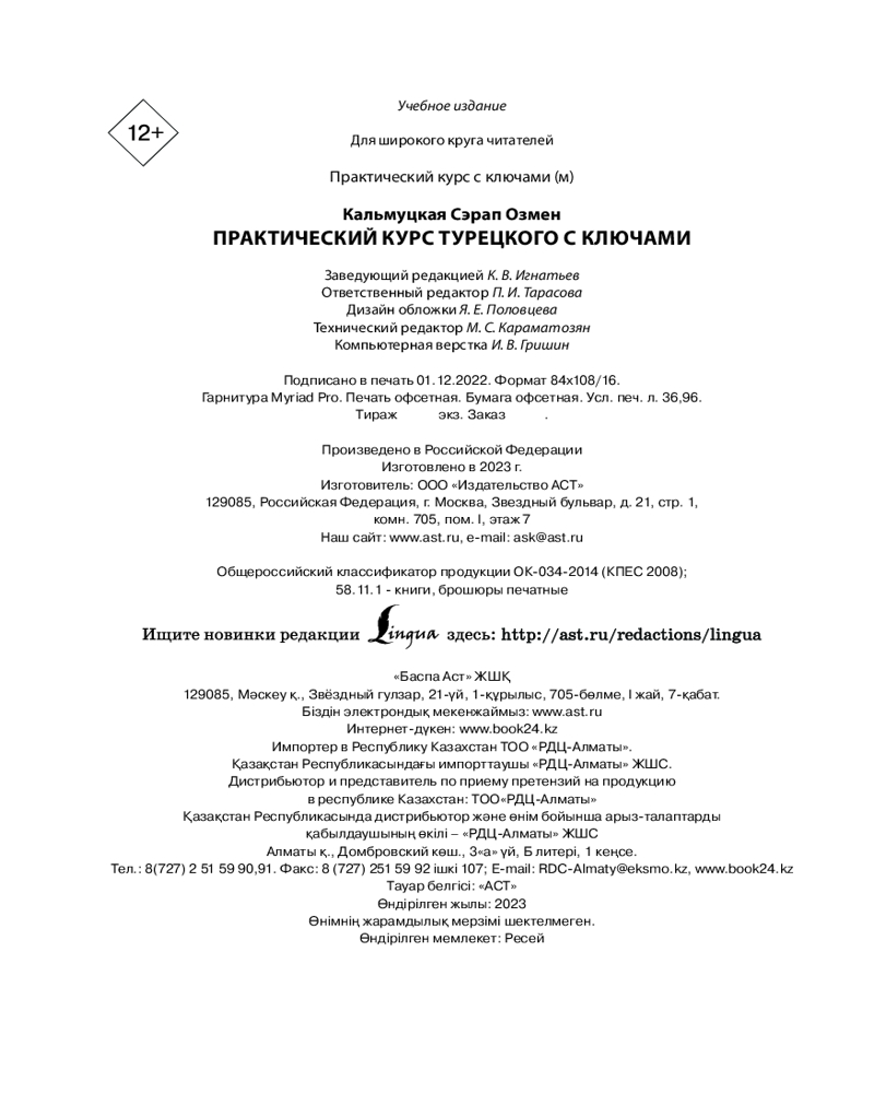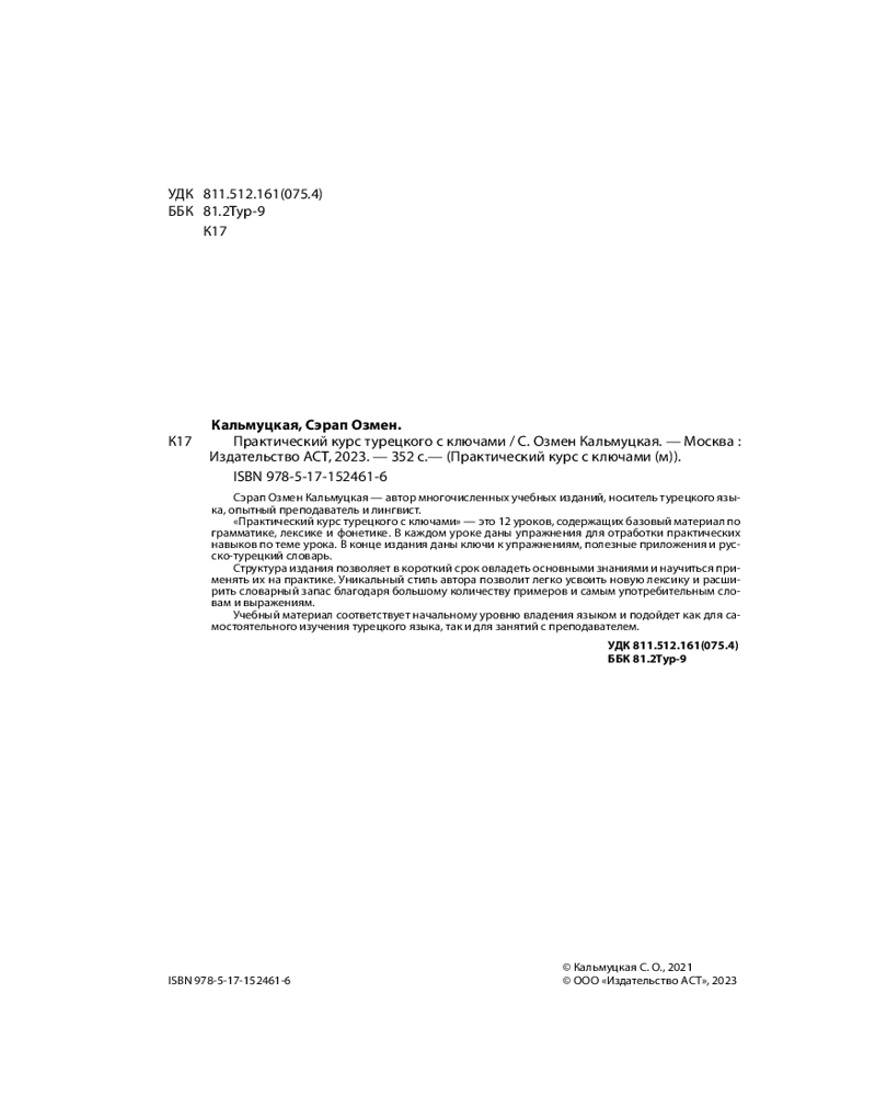 💳 Оплатить за товар можно при получении 🇰🇿 Есть бесплатная доставка по Казахстану 🎁 Копите бонусы с каждой покупки Серия: Практический курс с ключами (м) Сэрап Озмен Кальмуцкая — автор многочисленных учебных изданий, носитель турецкого языка, опытный преподаватель и лингвист. |
