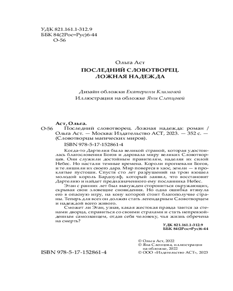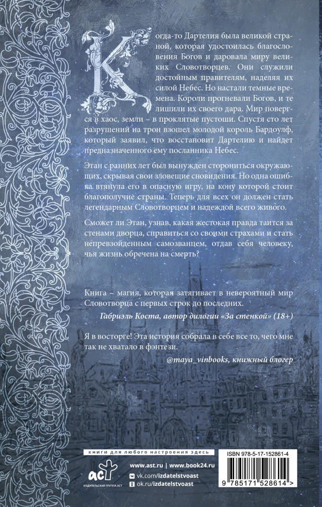 💳 Оплатить за товар можно при получении 🇰🇿 Есть бесплатная доставка по Казахстану от 1 дня 🎁 Копите бонусы с каждой покупки Серия: Словотворцы магических миров Когда-то Дартелия была великой страной, которая удостоилась благословения Богов и даровала миру великих Словотворцев. Они служили достойным правителям, наделяя их силой Небес. Но настали темные времена. Короли прогневали Богов, и те лишили их своего дара. Мир повергся в хаос, земли — в проклятые пустоши. Спустя сто лет разрушений на трон взошел молодой король Бардоулф, который заявил, что восстановит Дартелию и найдет предназначенного ему посланника Небес. |