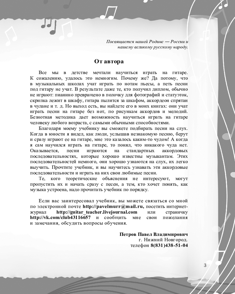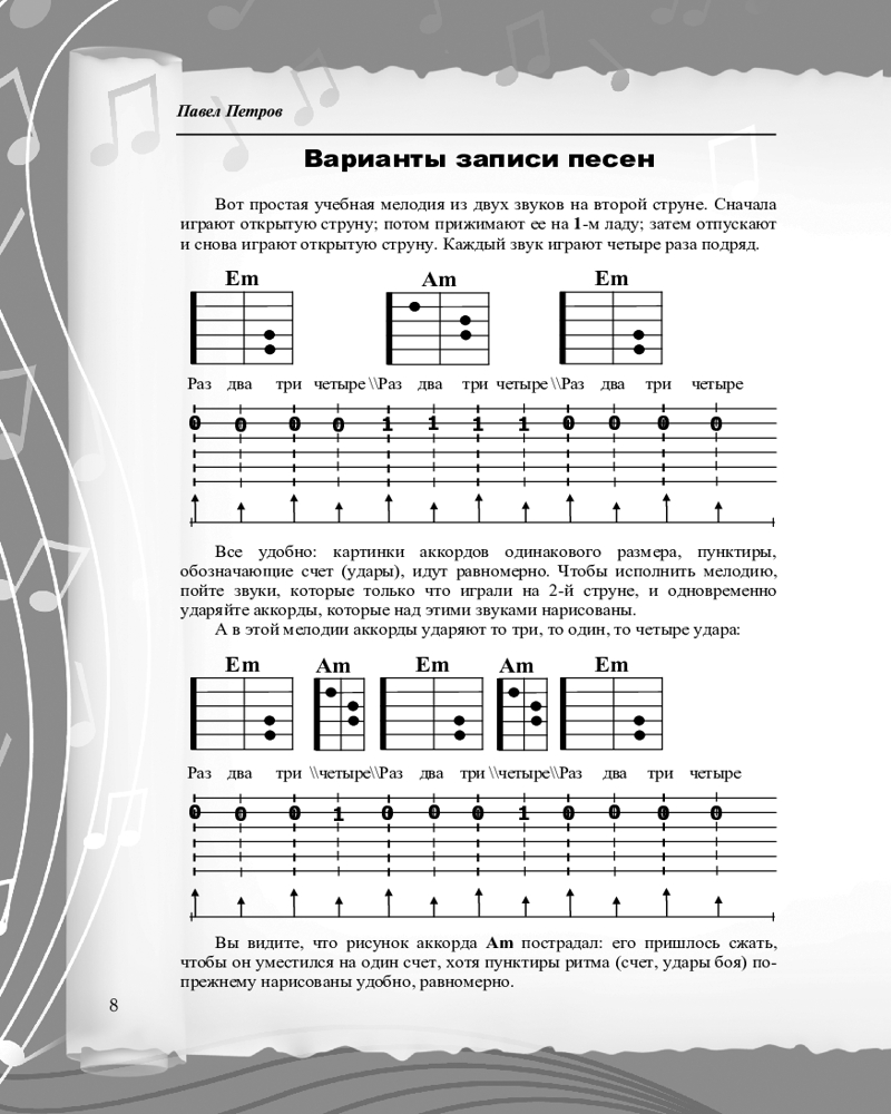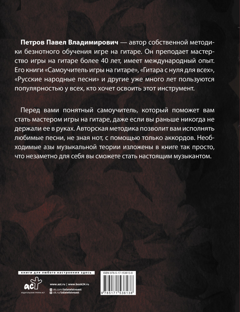 💳 Оплатить за товар можно при получении 🇰🇿 Есть бесплатная доставка по Казахстану от 1 дня 🎁 Копите бонусы с каждой покупки Серия: Гитара – это просто! Петров Павел Владимирович — автор собственной методики безнотного обучения игре на гитаре. Он преподает мастерство игры на гитаре более 40 лет, имеет международный опыт. Его книги «Самоучитель игры на гитаре», «Гитара с нуля для всех», «Русские народные песни» и другие уже много лет пользуются популярностью у всех, кто хочет освоить этот инструмент. |