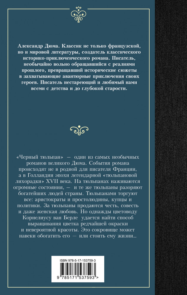 Черный тюльпанВ данный момент этот товар отсутствует в продаже. Возможно, у нас найдется аналогичный или похожий товар здесь. Серия: Лучшая мировая классика «Черный тюльпан» — один из самых необычных романов великого Дюма. События романа происходят не в родной для писателя Франции, а в Голландии эпохи легендарной «тюльпановой лихорадки» XVII века. На тюльпанах наживаются огромные состояния, — и те же тюльпаны разоряют богатейших людей страны. Тюльпанами торгуют все: аристократы и простолюдины, купцы и политики. За тюльпаны продаются честь, совесть и даже женская любовь. Но однажды цветоводу Корнелиусу ван Берле удается найти способ выращивания цветка редчайшей окраски и невероятной красоты. Это сокровище может навеки обогатить его — или стоить ему жизни... |