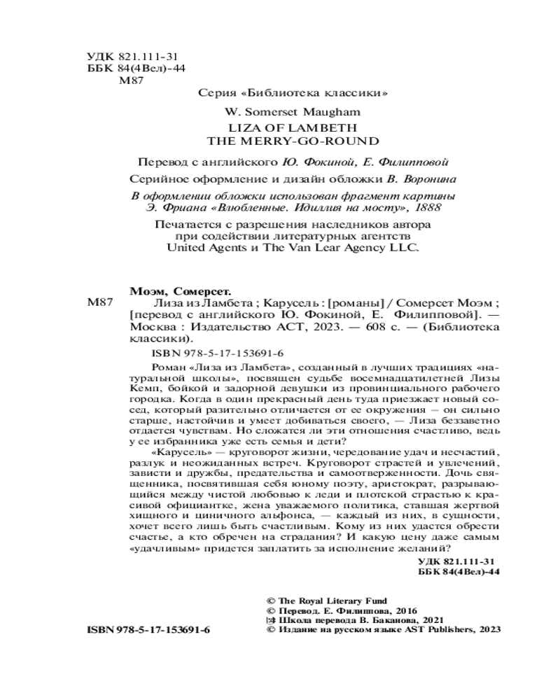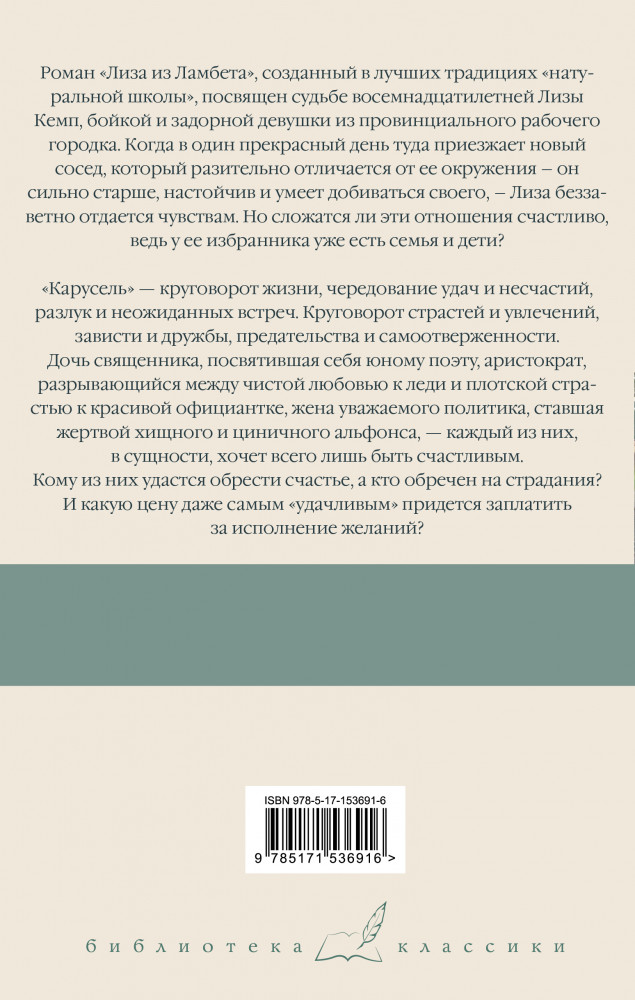 Лиза из Ламбета. КарусельВ данный момент этот товар отсутствует в продаже. Возможно, у нас найдется аналогичный или похожий товар здесь. Серия: Библиотека классики Роман «Лиза из Ламбета», созданный в лучших традициях «натуральной школы», посвящен судьбе восемнадцатилетней Лизы Кемп, бойкой и задорной девушки из провинциального рабочего городка. Когда в один прекрасный день туда приезжает новый сосед, который разительно отличается от ее окружения — он сильно старше, настойчив и умеет добиваться своего, — Лиза беззаветно отдается чувствам. Но сложатся ли эти отношения счастливо, ведь у ее избранника уже есть семья и дети? |