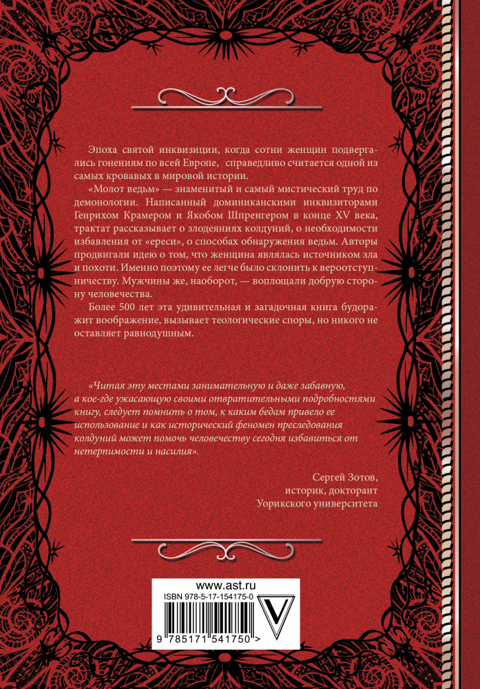 Молот ведьм с иллюстрациямиСергей Олегович Зотов, Якоб Шпренгер, Генрих Инститорис В данный момент этот товар отсутствует в продаже. Возможно, у нас найдется аналогичный или похожий товар здесь. Серия: Классика мысли Эпоха Святой инквизиции, когда сотни женщин подвергались гонениям по всей Европе, справедливо считается одной из самых кровавых в мировой истории. «Молот ведьм» — знаменитый и самый мистический труд по демонологии. Написанный доминиканскими инквизиторами Генрихом Крамером и Якобом Шпренгером в конце XV века, трактат рассказывает о злодеяниях колдуний, о необходимости избавления от «ереси», о способах обнаружения ведьм. Авторы продвигали идею о том, что женщина являлась источником зла и похоти. Именно поэтому ее легче было склонить к вероотступничеству. Мужчины же наоборот — воплощали добрую сторону человечества. Более 500 лет эта удивительная и загадочная книга будоражит воображение, вызывает теологические споры, но никого не оставляет равнодушным. |