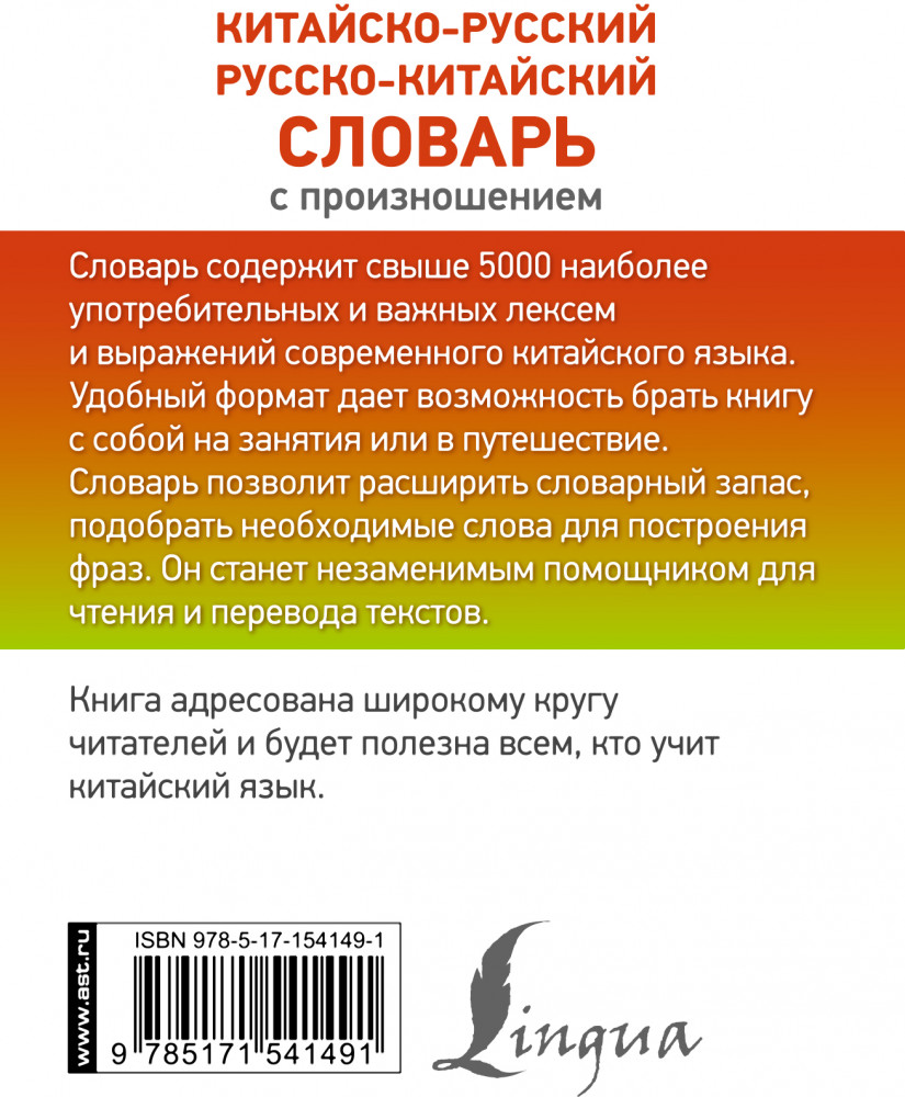 💳 Оплатить за товар можно при получении 🇰🇿 Есть бесплатная доставка по Казахстану 🎁 Копите бонусы с каждой покупки Серия: Карманная библиотека словарей: лучшее В словаре представлено свыше 5000 наиболее употребительных и важных лексем и выражений современного китайского языка. Все слова в обеих частях снабжены официальной китайской транскрипцией на латинской основе ханьюй пиньинь, что позволит запомнить не только правильное произношение, но и верный рисунок тонов. Авторы также разработали кириллическую транскрипцию, которая облегчит вхождение в язык начинающим, еще не вполне освоившим ханьюй пиньинь, и ввели ее в китайско-русском словаре наравне с официальной китайской транскрипцией. Подробная инструкция в начале и краткий справочник по тонам позволят легко ориентироваться в словаре. |