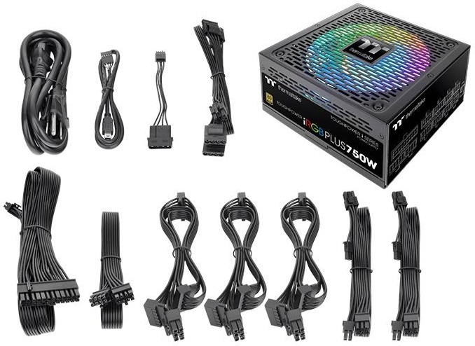 Блок питания Thermaltake Toughpower i RGB PLUS 750W Digital [PS-TPI-0750F3FDGE-1] выполнен в корпусе формата ATX полностью модульного типа, за счет чего обеспечивается удобная установка и подключение. Для основного питания используется разъем (20+4)-pin, для питания процессора — один (4+4)-pin. Подача энергии на видеокарту осуществляется посредством 4 коннекторов (6+2)-pin. Для подключения SATA-накопителей предусмотрено 9 коннекторов на 15-pin, что позволит легко создать вместительное файловое хранилище. Блок питания поставляется вместе с крепежами и набором кабелей.