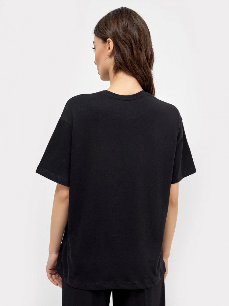 Мне очень понравилась эта футболка. Она свободная, но сидит очень аккуратно, не мешком. Цвет необычный и очень красивый.