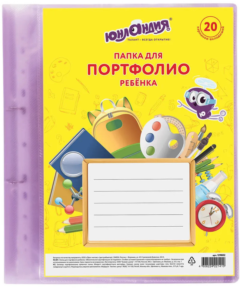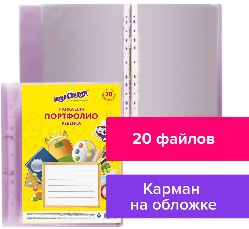 Юнландия Папка-портфолио для ребенкаВ данный момент этот товар отсутствует в продаже. Возможно, у нас найдется аналогичный или похожий товар здесь. Портфолио имеет кольцевое крепление, с помощью которого крепятся 20 файлов. В нем можно хранить всевозможные грамоты, дипломы, фотографии и другие достижения школьника. Папка для портфолио ЮНЛАНДИЯ позволяет учитывать результаты, достигнутые учеником в разнообразных видах деятельности: учебной, творческой, социальной. |