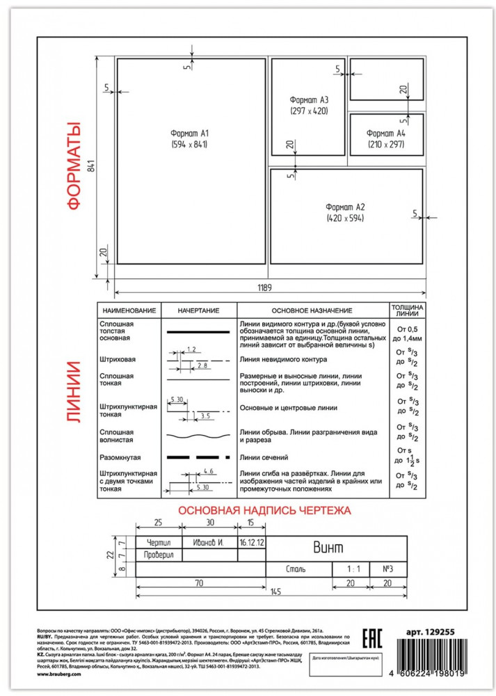 💳 Оплатить за товар можно при получении 🇰🇿 Есть бесплатная доставка по Казахстану от 1 дня 🎁 Копите бонусы с каждой покупки Папка для черчения содержит набор листов ватмана для выполнения чертежно-графических работ карандашами, тушью и чернилами. Внутренний блок содержит 24 листа производства ГОЗНАК КБФ плотностью 200 г/м2. Обложка выполнена из импортного мелованного картона плотностью 235 г/м2. |