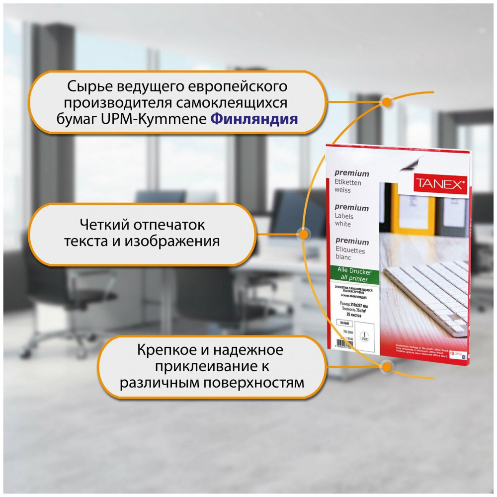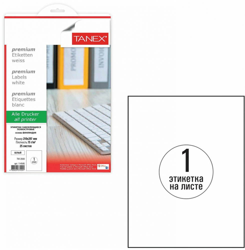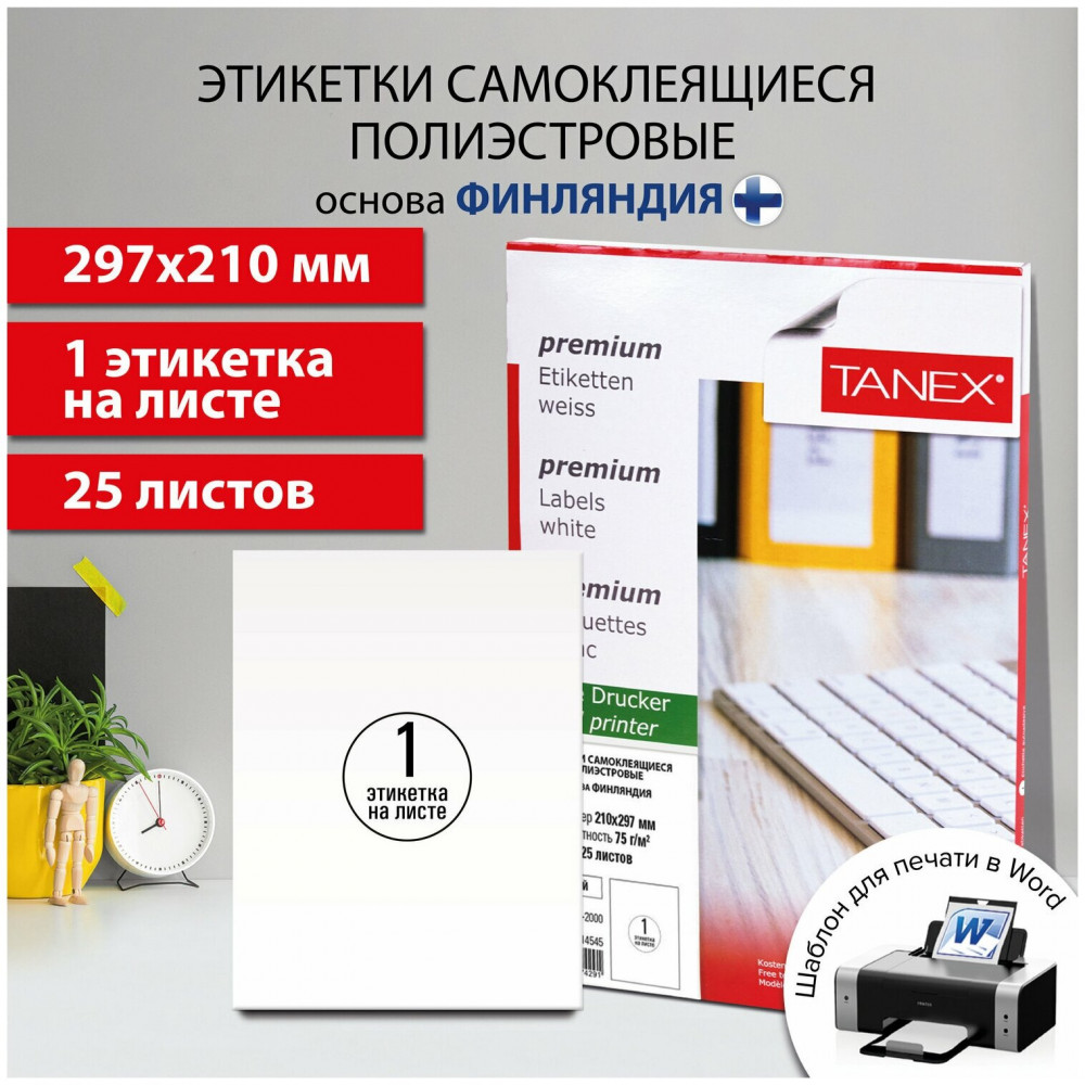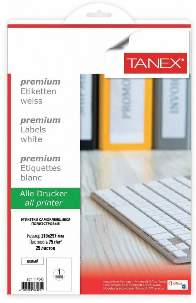 💳 Оплатить за товар можно при получении 🇰🇿 Есть бесплатная доставка по Казахстану от 1 дня 🎁 Копите бонусы с каждой покупки Самоклеящиеся этикетки Tanex производятся из высококачественного сырья ведущего европейского производителя UPM-Kymmene Финляндия. Предназначены для надежной маркировки как внутри помещений, так и на улице. Изготовлены из полиэстра белого цвета плотностью 75 г/м2. Этикетки обладают особой устойчивостью к воздействию загрязняющих веществ, влаги, перепадам температуры. Совместимы с лазерными принтерами. Упаковка содержит 25 листов формата А4, на каждом листе — одна этикетка размером 210×297 мм. |