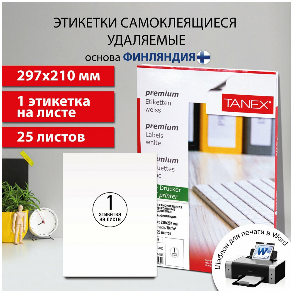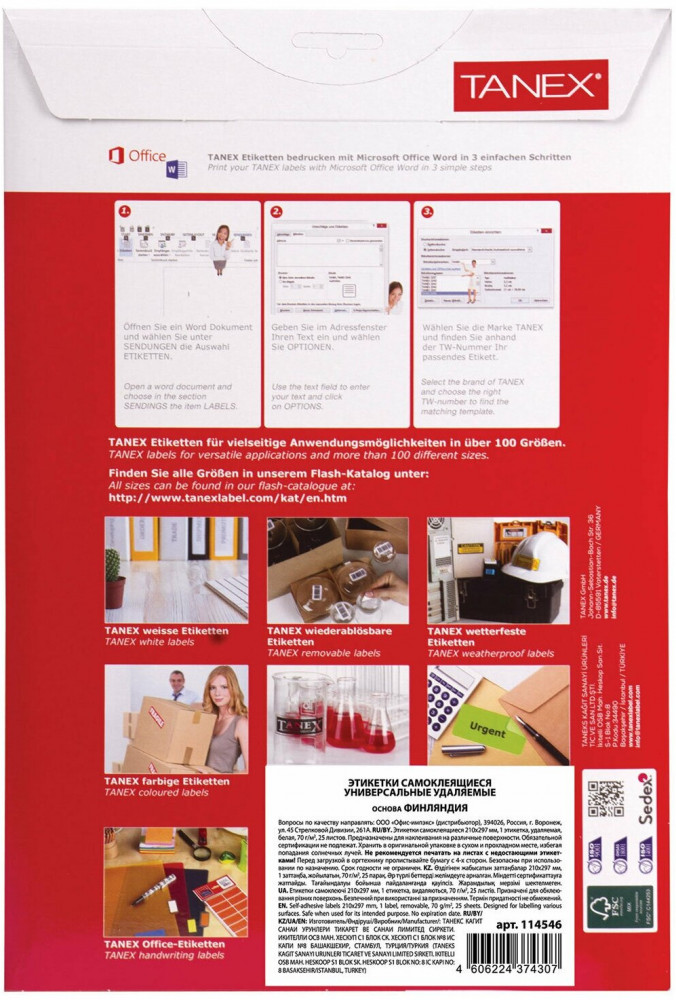 💳 Оплатить за товар можно при получении 🇰🇿 Есть бесплатная доставка по Казахстану от 1 дня 🎁 Копите бонусы с каждой покупки Самоклеящиеся удаляемые этикетки Tanex производятся из высококачественного сырья ведущего европейского производителя UPM-Kymmene Финляндия. Этикетки отлично приклеиваются к разным поверхностям и без труда удаляются, не оставляя следов. Изготовлены из бумаги белого цвета плотностью 70 г/м2. Упаковка содержит 25 листов формата А4, на каждом листе — одна этикетка размером 210×297 мм. Для удобства отделения этикетки от подложки, на обороте по длинной стороне есть надсечка. |