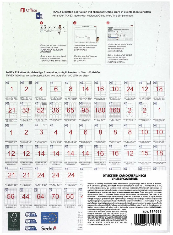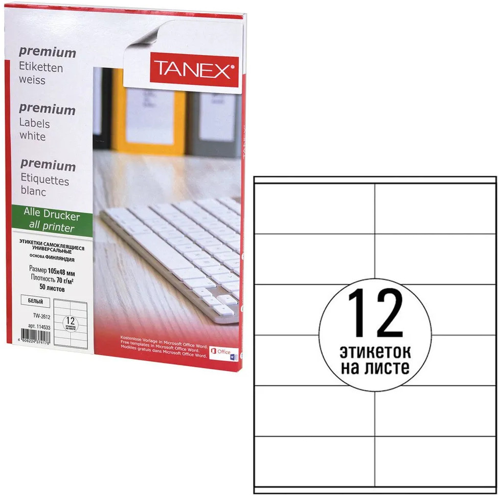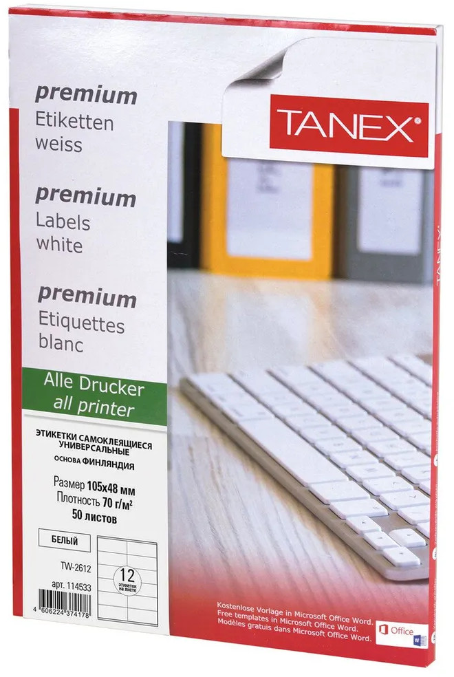 Универсальные самоклеящиеся этикетки Tanex производятся из высококачественного сырья ведущего европейского производителя UPM-Kymmene, Финляндия. Самоклеящиеся этикетки позволят быстро и качественно подготовить адресные наклейки, регистрационные номера, аннотации при помощи лазерного или струйного принтера.